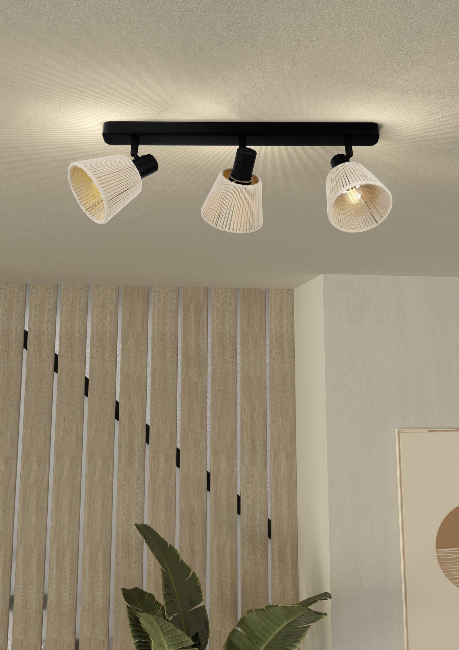 La lampada a barra SEAGARD convince con un mix espressivo di metallo nero e paralumi in tessuto finemente lavorati. Su un lungo baldacchino sono montati tre faretti regolabili, i cui paralumi sono realizzati con sottili fili color crema disposti su due strati. Il design arioso crea un affascinante gioco di luci e ombre e conferisce a ogni ambiente un tocco caldo e artigianale. Le prese E14 offrono la libertà di scegliere le lampadine secondo le preferenze personali – sia lampadine a filamento per un’illuminazione d’atmosfera, sia LED per un’elevata efficienza energetica. La lampada esprime il suo carattere decorativo soprattutto in soggiorni, zone pranzo o camere da letto.