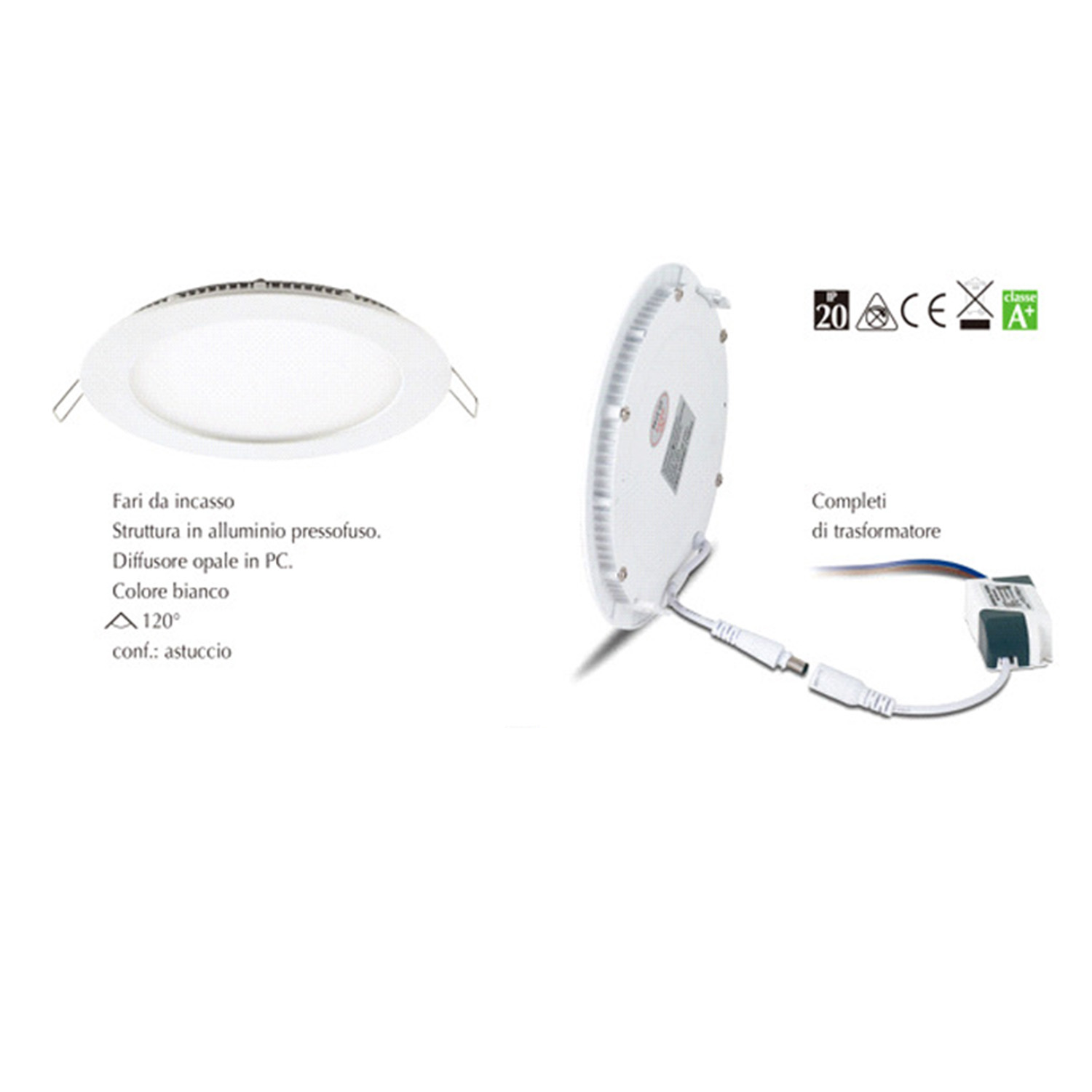 Faro da incasso a LED 6W - 360Lumen - Luce Calda 3000K - Ang. Flusso Luce 180° - Ø Faro 120mm - Ø Foro 105mm - IP20 - Ghiera Bianc.