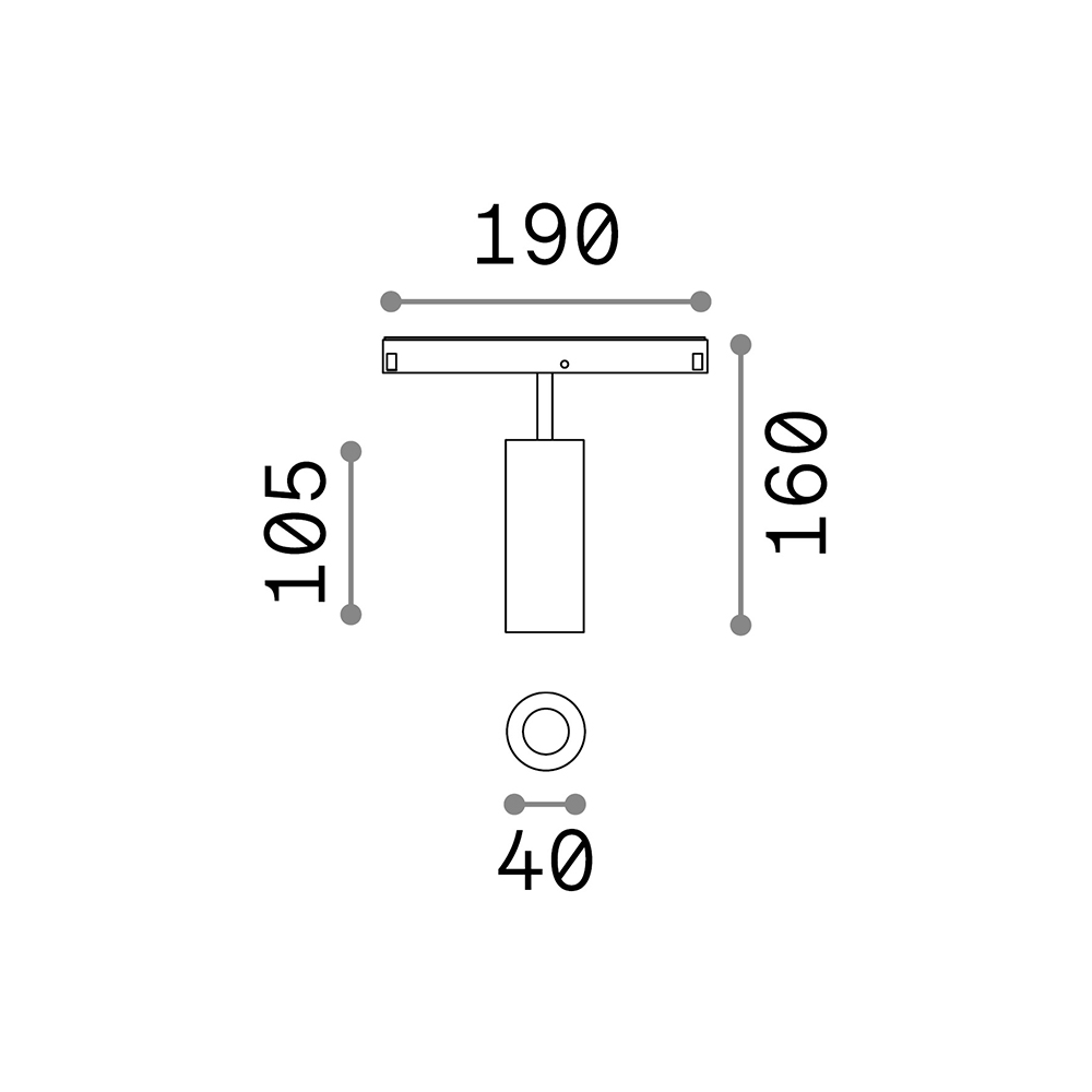 Faretto orientabile montato su binario per interni con sorgente LED integrata da 12W ed emissione di luce diretta.. Sistema composto da un profilo in alluminio estruso ed elementi di illuminazione a fissaggio magnetico.