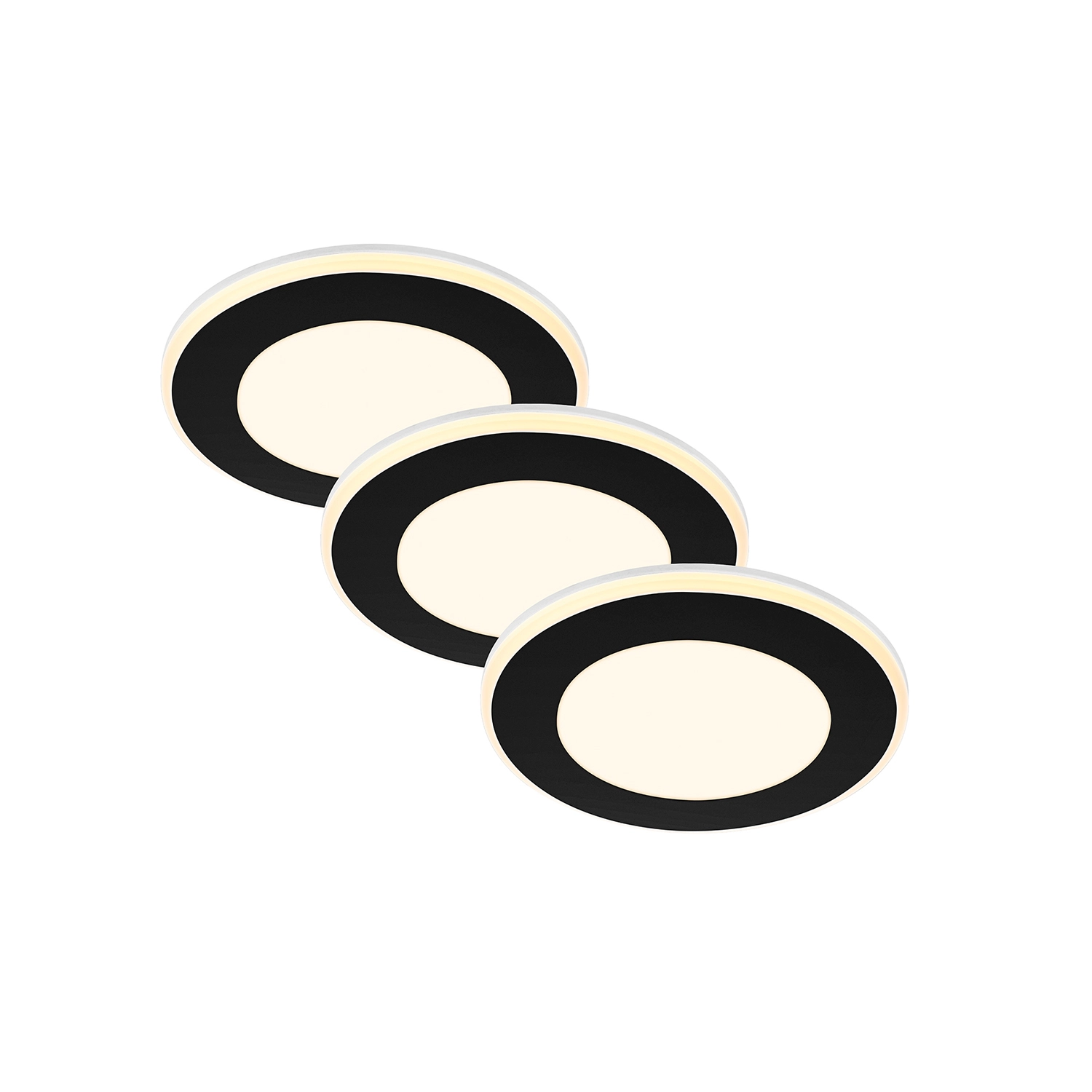Set di 3 faretti da incasso a LED + funzione luce notturna Plastica/nero opaco. inclusa 3x scheda LED 4,9W 425lm, 3000K Incl. 3x anelli luminosi notturni per circuiti stampati LED 3000K Durata 15.000 ore, Ra>=80 Commutazione a 3 livelli tramite interruttore a parete (luce centrale accesa, solo bordo acceso, tutto acceso, spento), inclusa la memoria IP20 Ø92,9x24,2mm (PxA)