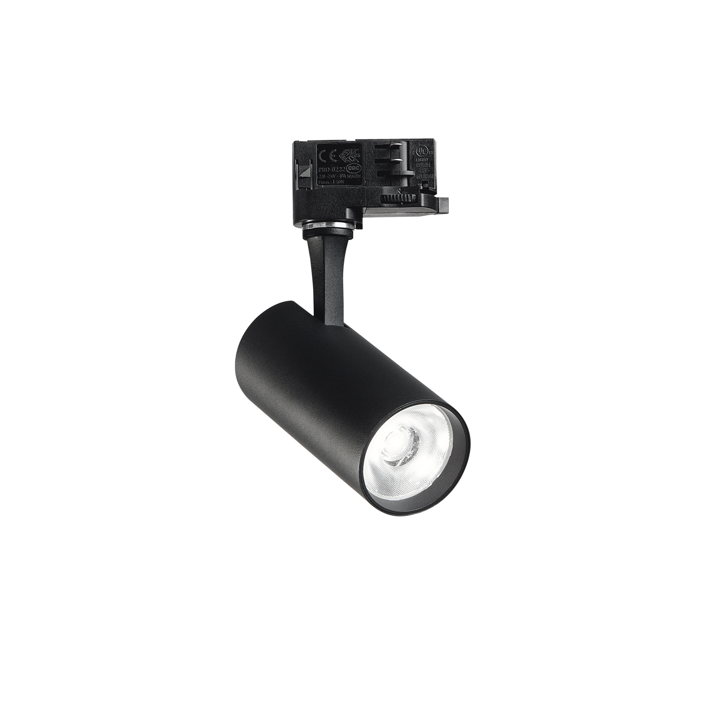 Illuminazione a Binario Contemporaneo Fox Alluminio Nero Led Integrato 15W 4000K IP20 A++ h.17,2 D. L.7,5 P.6 Lampadina inclusa. Proiettore cilindrico in alluminio estruso, adatto per installazione su binario trifase. Verniciatura a polveri in bianco, nero oppure ottone satinato, testata girevole 350° e orientabile fino a 90°.