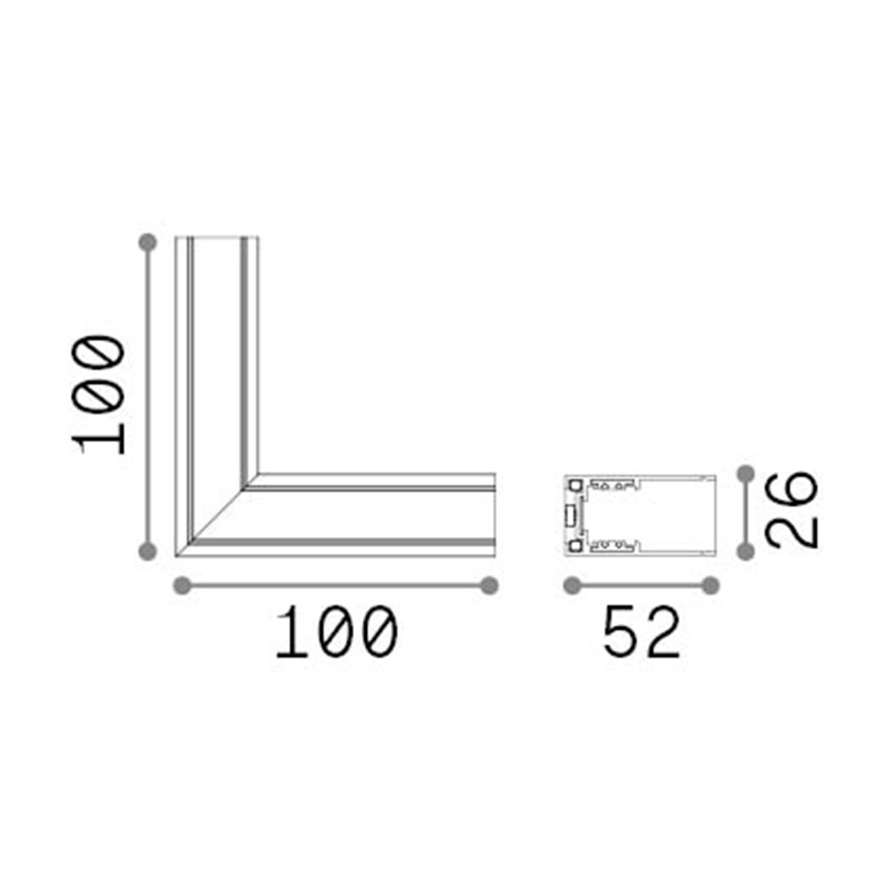 Sistema di connettore ad angolo per binario con profilo in alluminio estruso ed elementi di illuminazione a fissaggio magnetico.