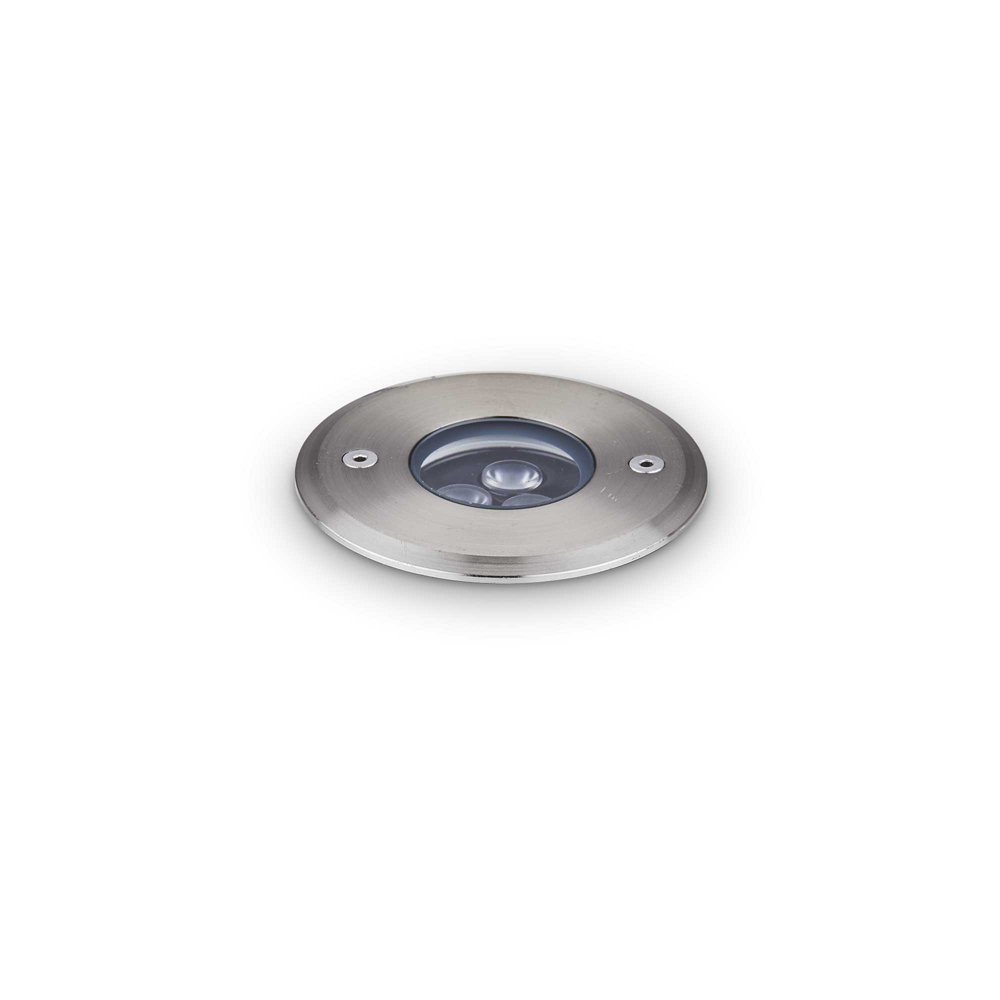 Faretto ad Incasso fisso da esterni in alluminio pressofuso con ghiera rotonda diam. 9 cm, adatto per installazione a terra e a pavimento.. Finitura in alluminio anodizzato con diffusore in vetro temprato extrachiaro. LED integrati 3 W raffreddati passivamente
