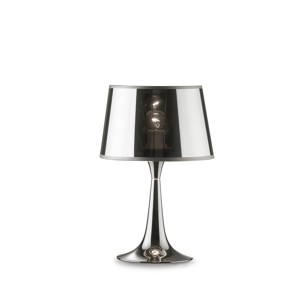 Collezione LONDONINFLUENZE ENGLISHLampada da tavolo a 1 luce con montatura in metallo cromato. Paralume in lamina di PVC cromata e semi trasparente. Disponibile in d..