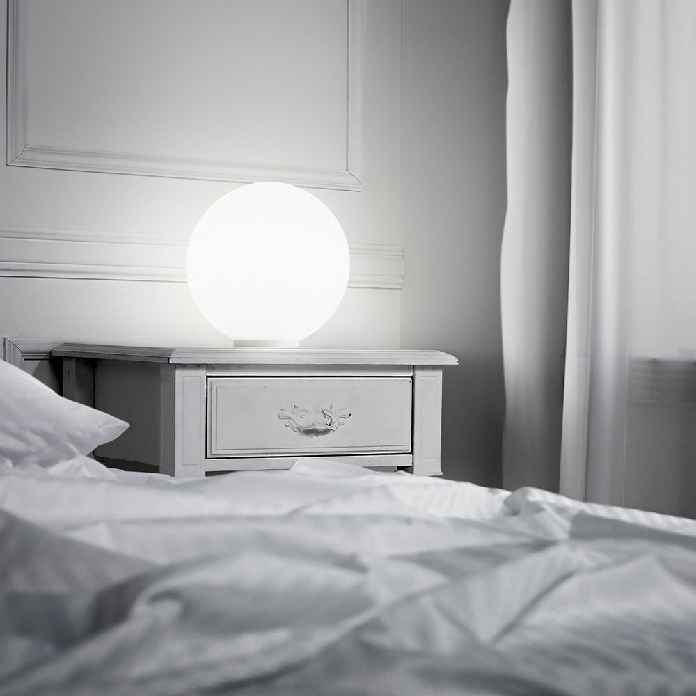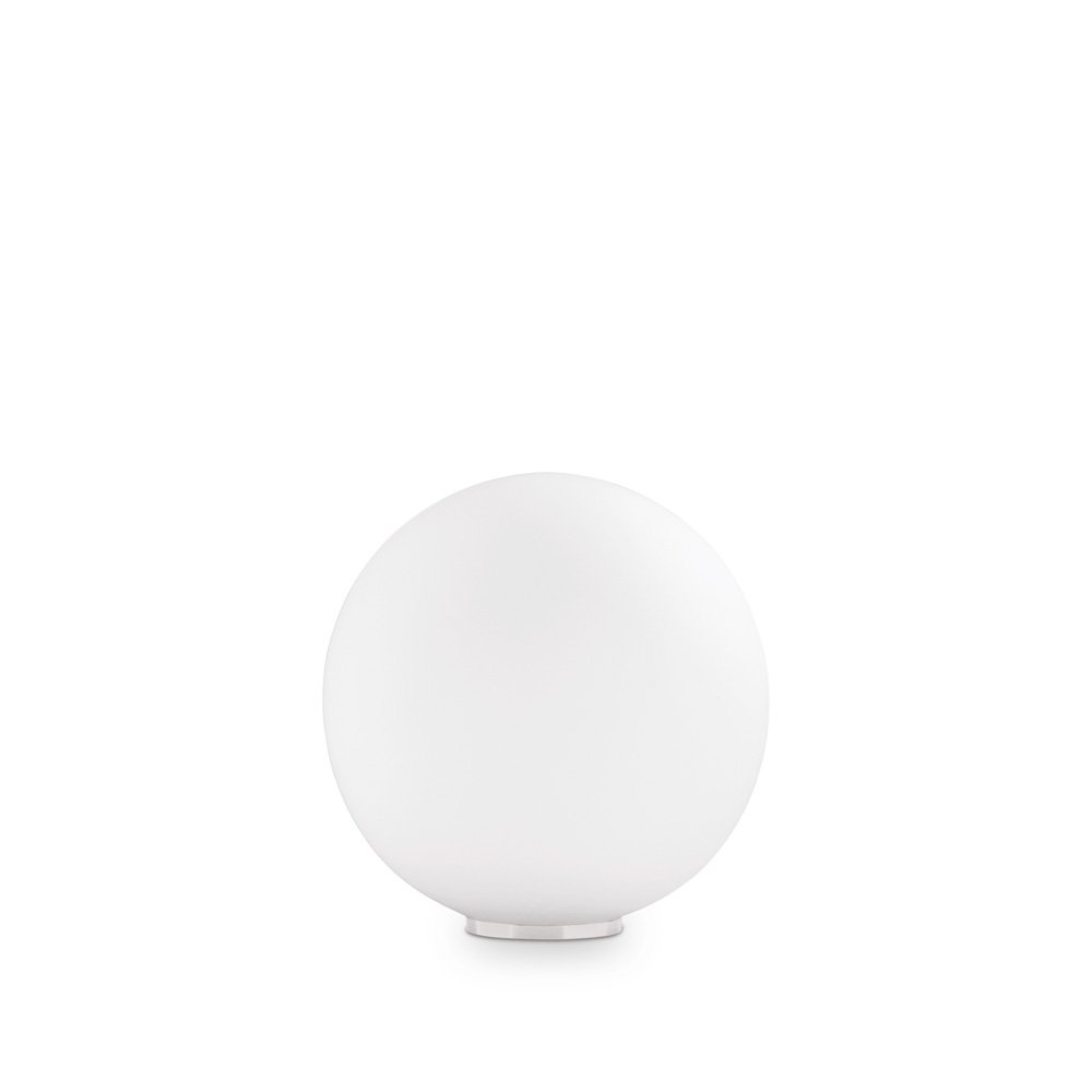 Lampada da tavolo a 1 luce con montatura in metallo. Diffusore a sfera in vetro bianco soffiato e acidato.. Diametro 20 cm altezza 21 cm. Un tocco semplice e sofisticato ai tuoi interni.