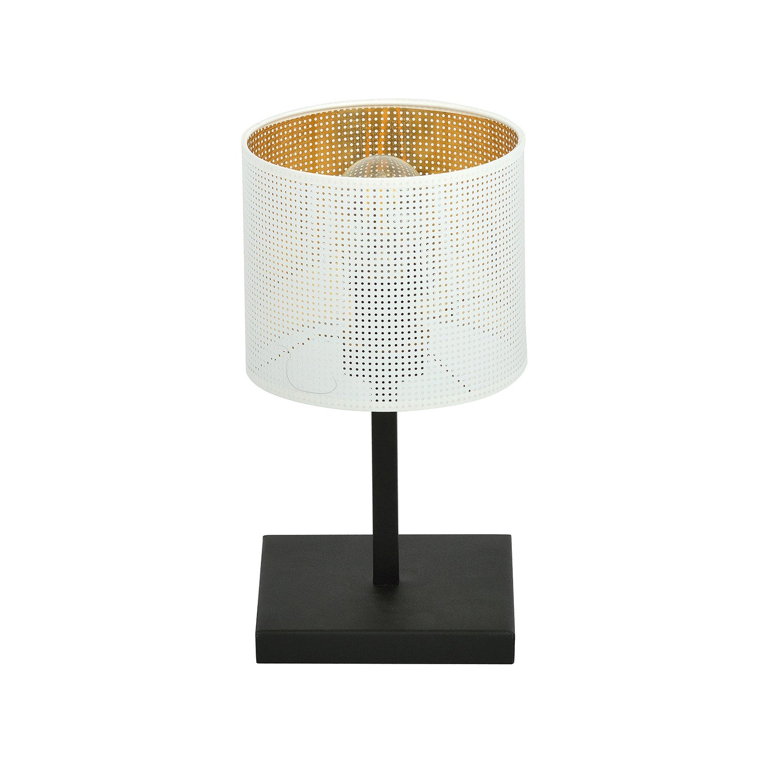 Lampada da tavolo con base quadrata in metallo nero con braccio e paralume cilindrico perforato in plastica e tessuto bianco all'esterno e oro all'interno. La sua struttura semplice si adatta a qualsiasi interno e i coprilampada con un interessante motivo traforato lasciano passare molta luce, creando un'atmosfera unica nella stanza.