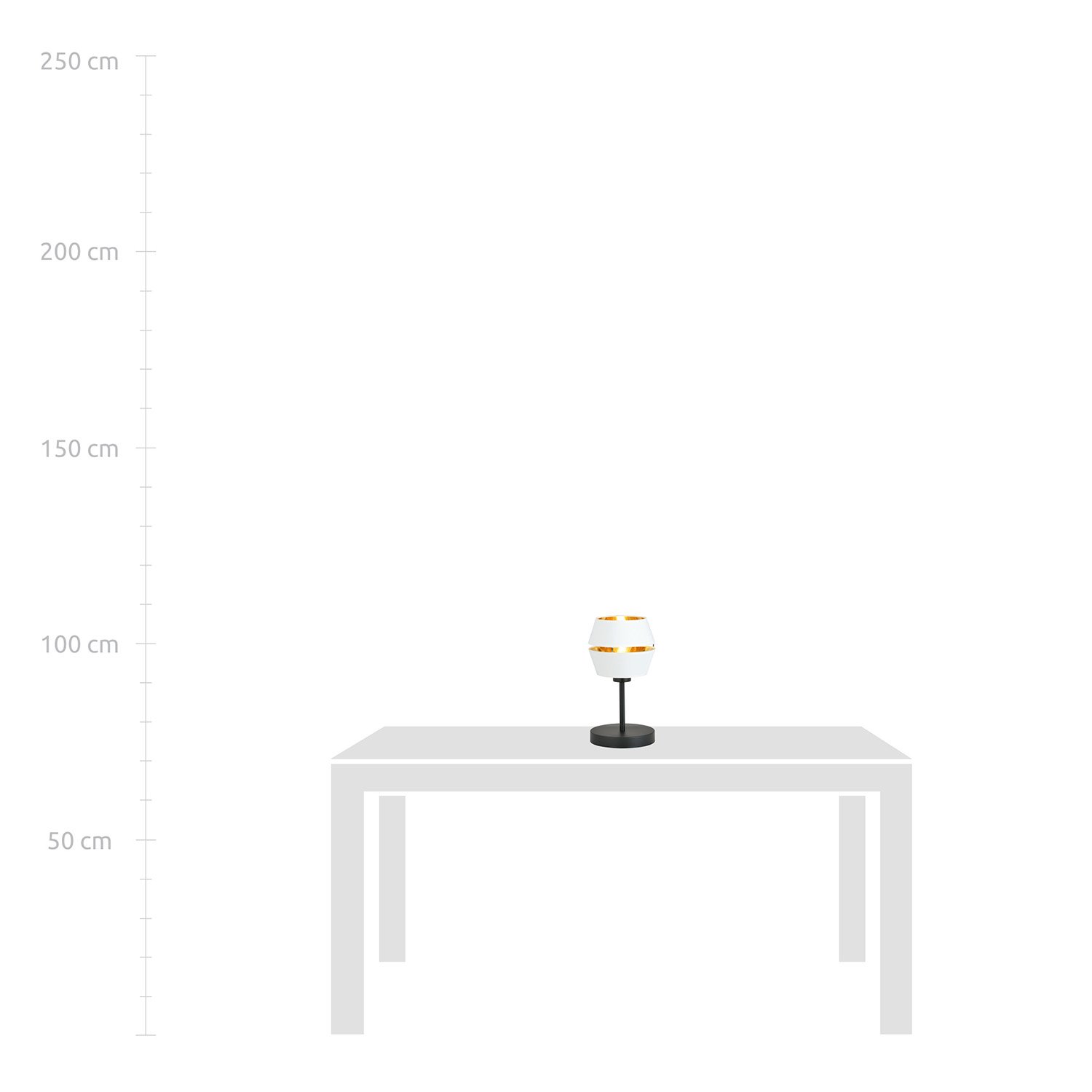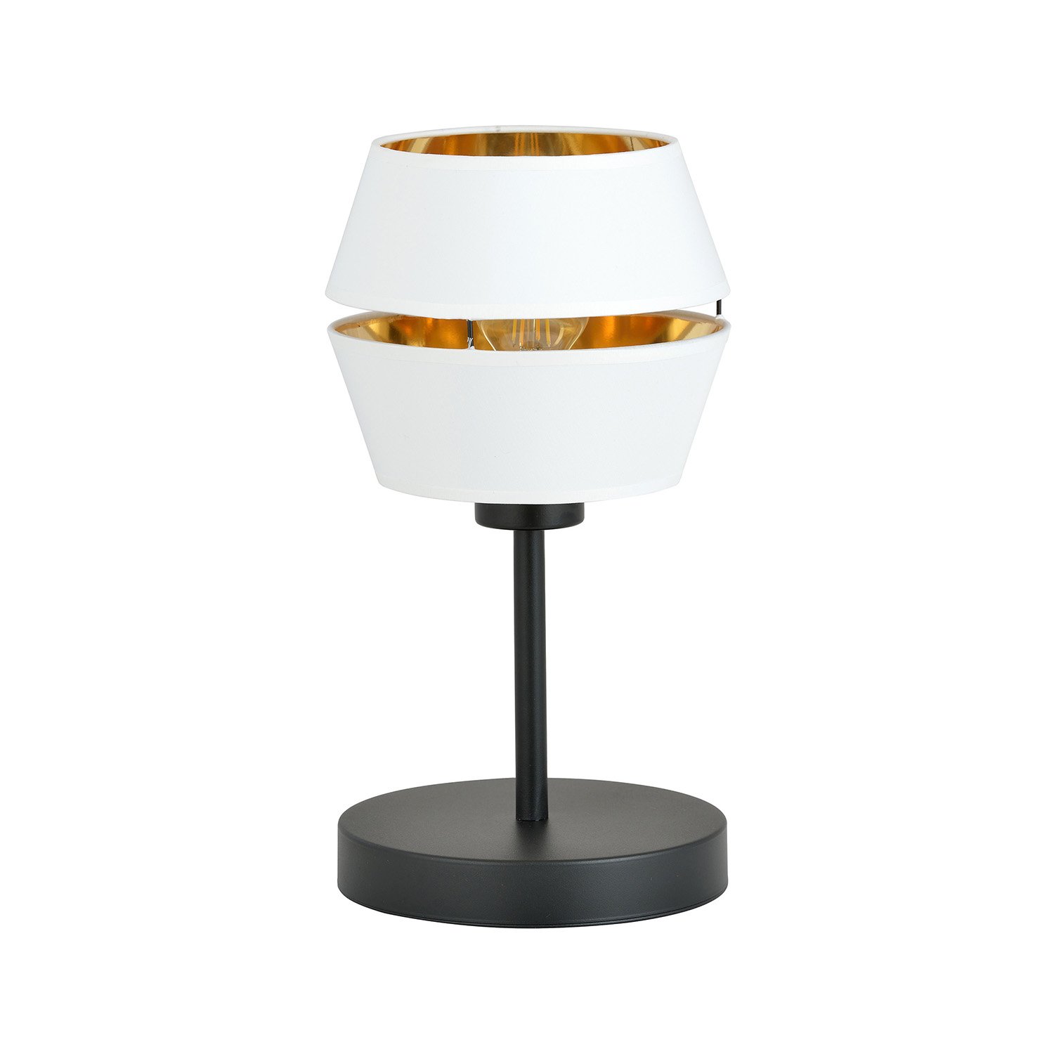 Lampada da tavolo contemporanea con base in metallo di colore nero e paralume in metallo rivestito in tessuto bianco all'esterno e oro all'interno. . Il suo paralume originale con interno dorato conferisce un carattere unico alla stanza. Creando un'atmosfera magica e suggestiva, irradia un calore sensuale. La costruzione semplice e l'elegante palette di colori garantiscono una perfetta armonia tra praticità e raffinatezza.
