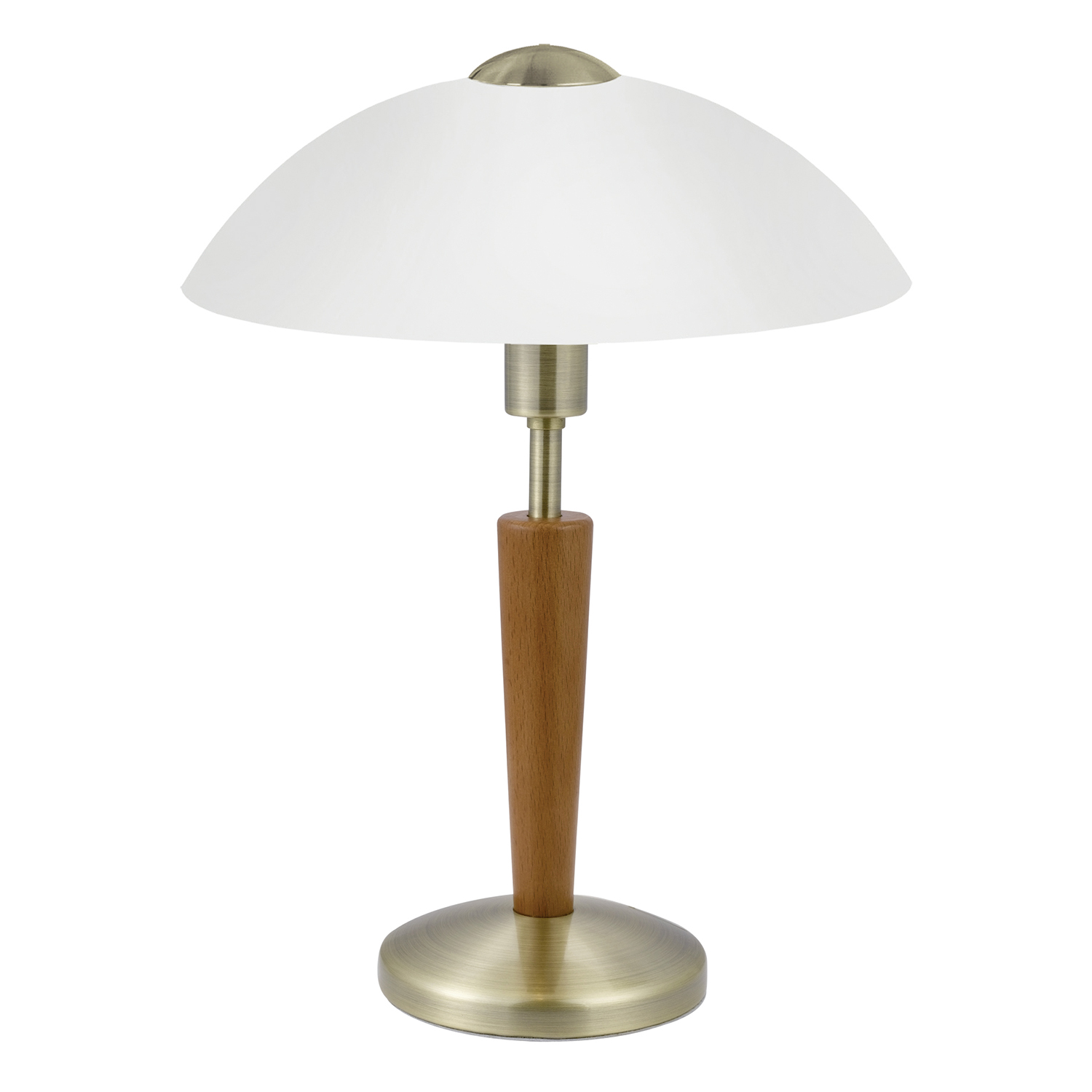La lampada da tavolo SOLO 1 è composta da una base in metallo nichelato e da un paralume rotondo in vetro satinato bianco.. La base della lampada è stata abbinata a un elemento in legno color noce, che completa sapientemente lo stile country di questa lampada da tavolo, che può essere comodamente accesa e spenta toccando l'area "Touch me" sulla base. La lampadina non è contenuta nella confezione.