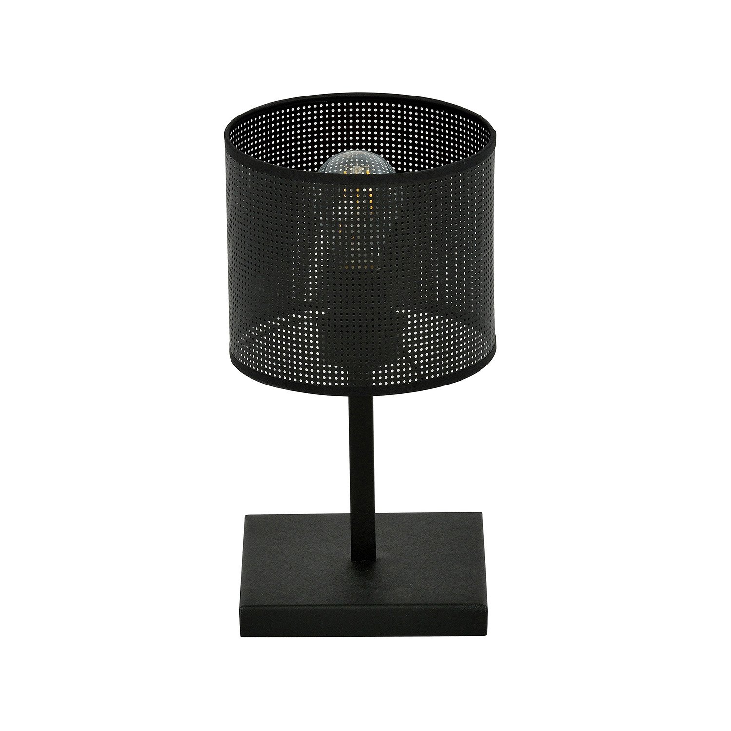 Lampada da tavolo realizzata con base quadrata in metallo di colore nero con braccio e paralume cilindrico perforato in plastica e tessuto di colore nero. La sua struttura semplice si adatta a qualsiasi interno e i coprilampada con un interessante motivo traforato lasciano passare molta luce, creando un'atmosfera unica nella stanza.