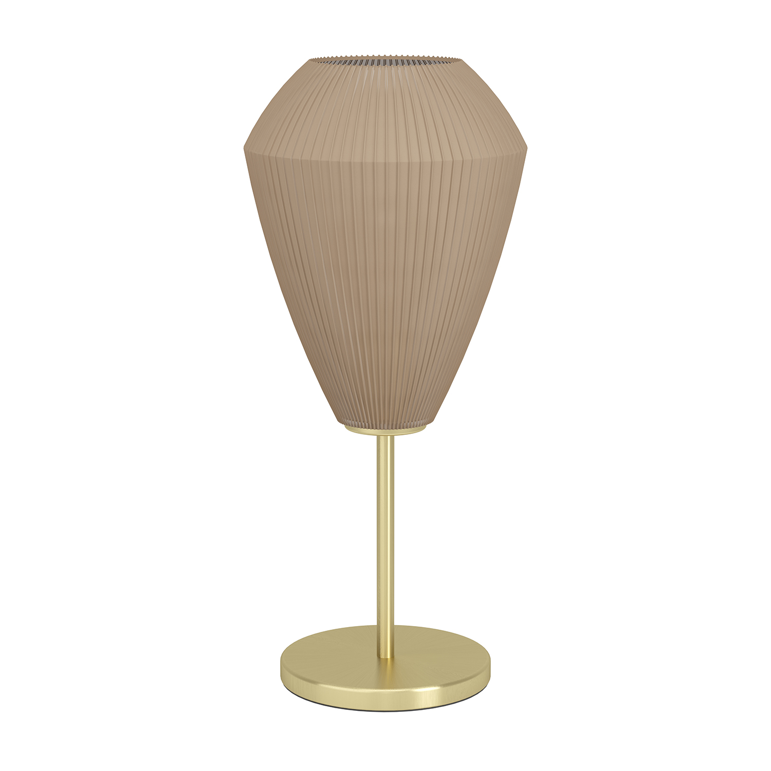 La lampada da tavolo CAPRAROLA moderna ha una struttura in Acciaio ottone spazzolato con diffusore in Vetro color sabbia.. 1 luce E27 (non inclusa) IP20 adatto per Ufficio - Studio, Soggiorno - Sala da Pranzo e Camera da Letto. Dimensioni: 46x20cm