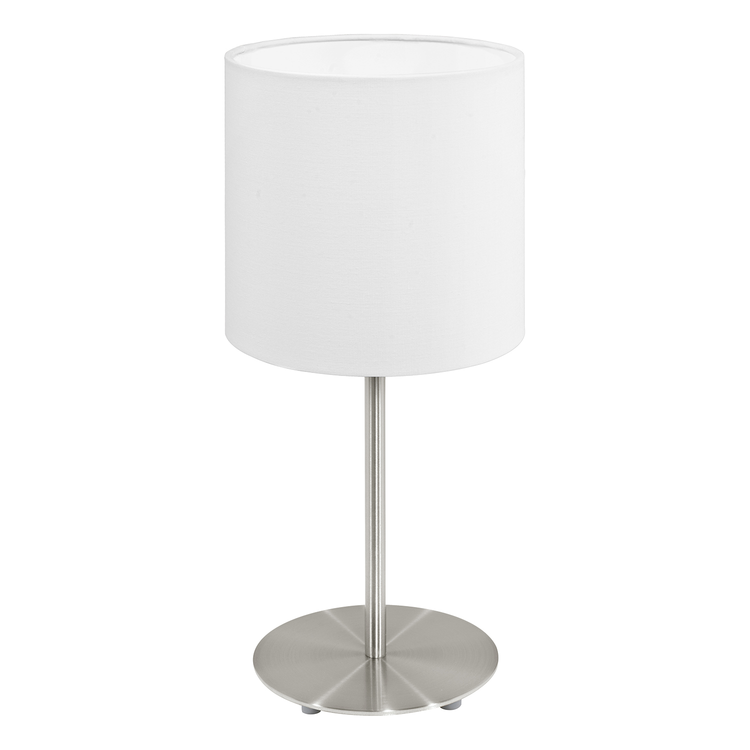 La lampada da tavolo PASTERI è composta da una base in metallo nichelato e da un paralume rotondo in tessuto bianco.. Il suo design semplice è perfetto per gli interni moderni. É possibile accendere e spegnere la luce tramite un interruttore presente sul cavo. Crea un'illuminazione d'accento per il tuo angolo relax. La lampadina non è inclusa nella confezione. Qualsiasi lampadina con attacco E27 è adatta per questa lampada.