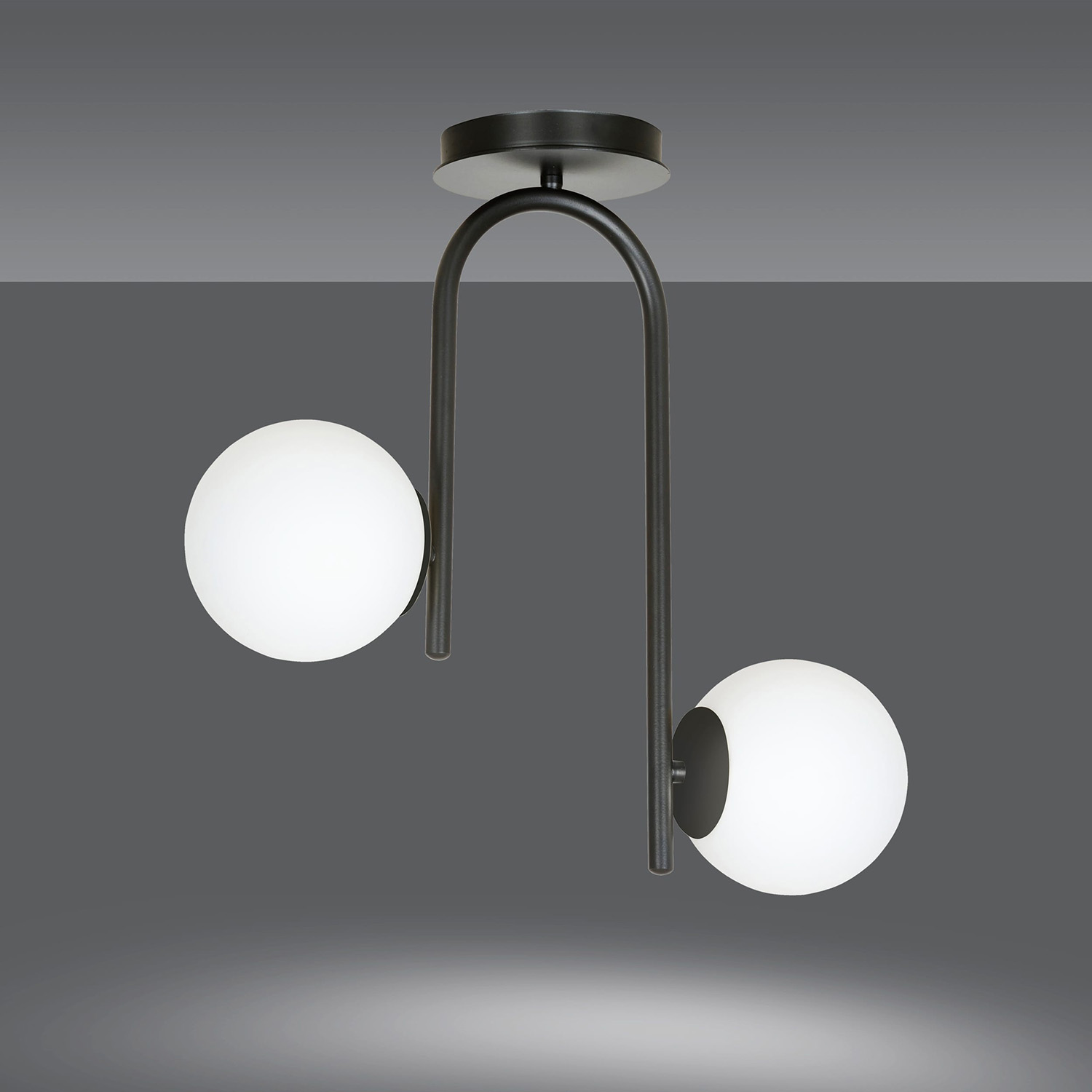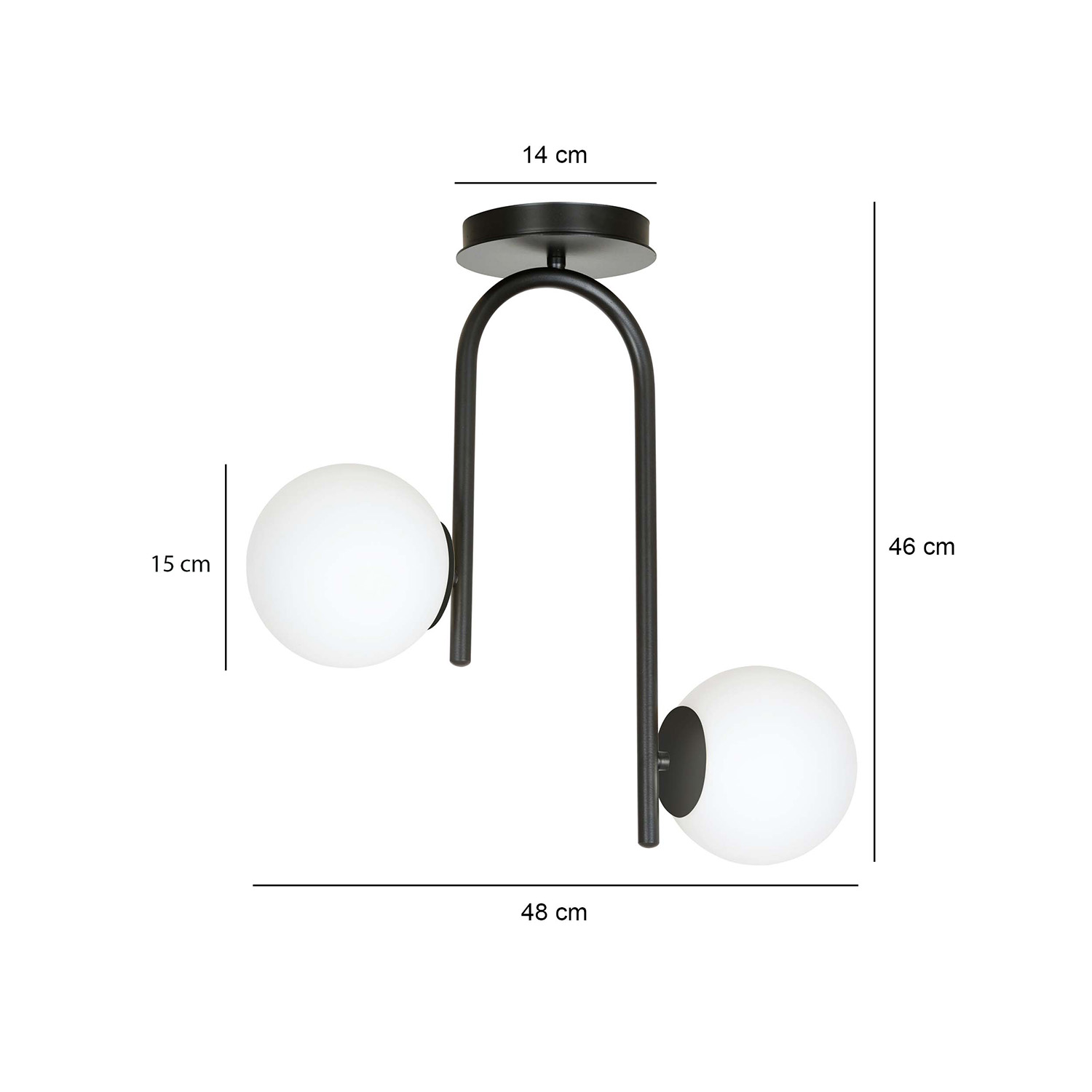 Lampadario moderno 2 luci con corpo in metallo nero con braccio curvo e 2 paralumi in vetro opalino di forma sferica. Sembrano più impressionanti sospesi su un tavolo o un'isola, donando alla stanza un'atmosfera unica. La delicata tonalità lattiginosa aggiunge eleganza e leggerezza alla serie KALF. Il design minimalista illuminerà perfettamente anche gli spazi più ampi e si adatterà perfettamente alla maggior parte delle sistemazioni domestiche.