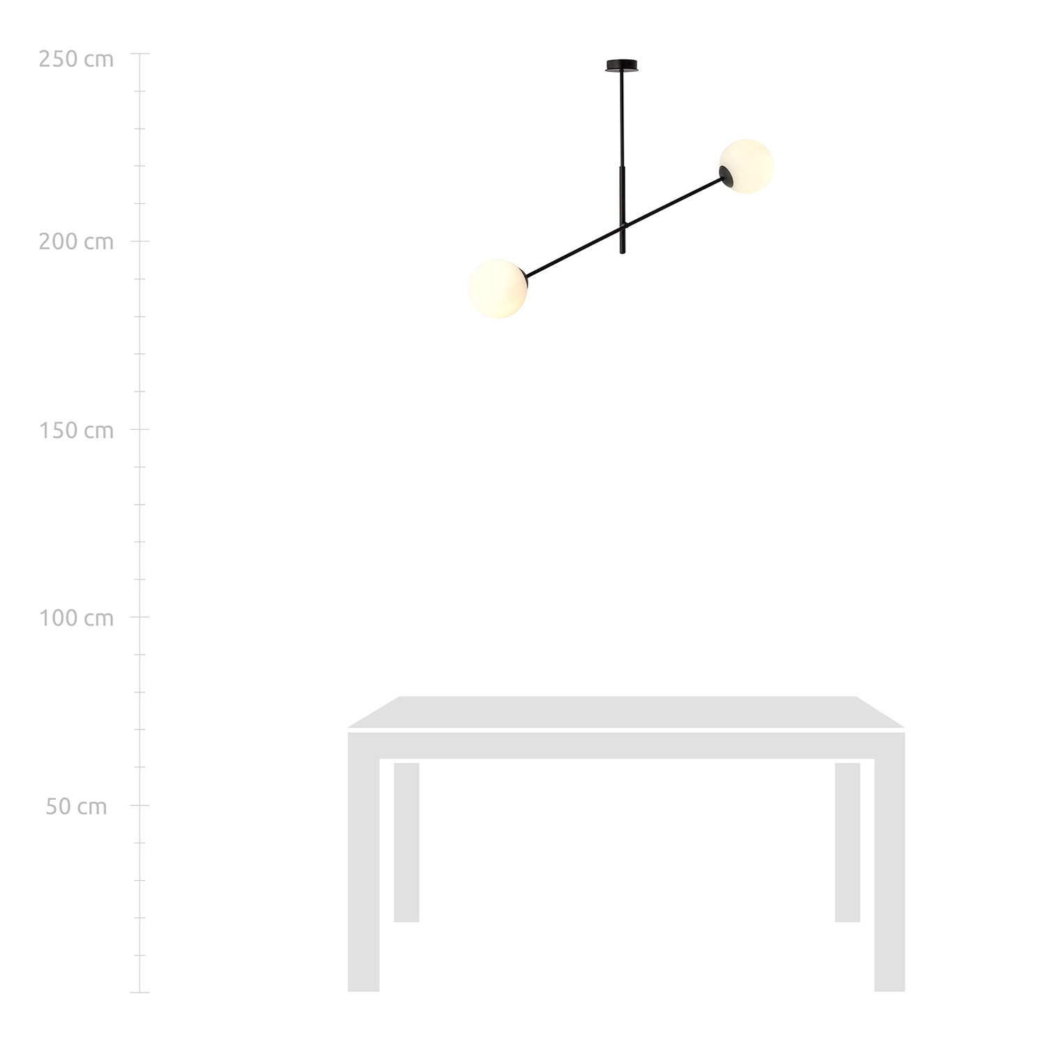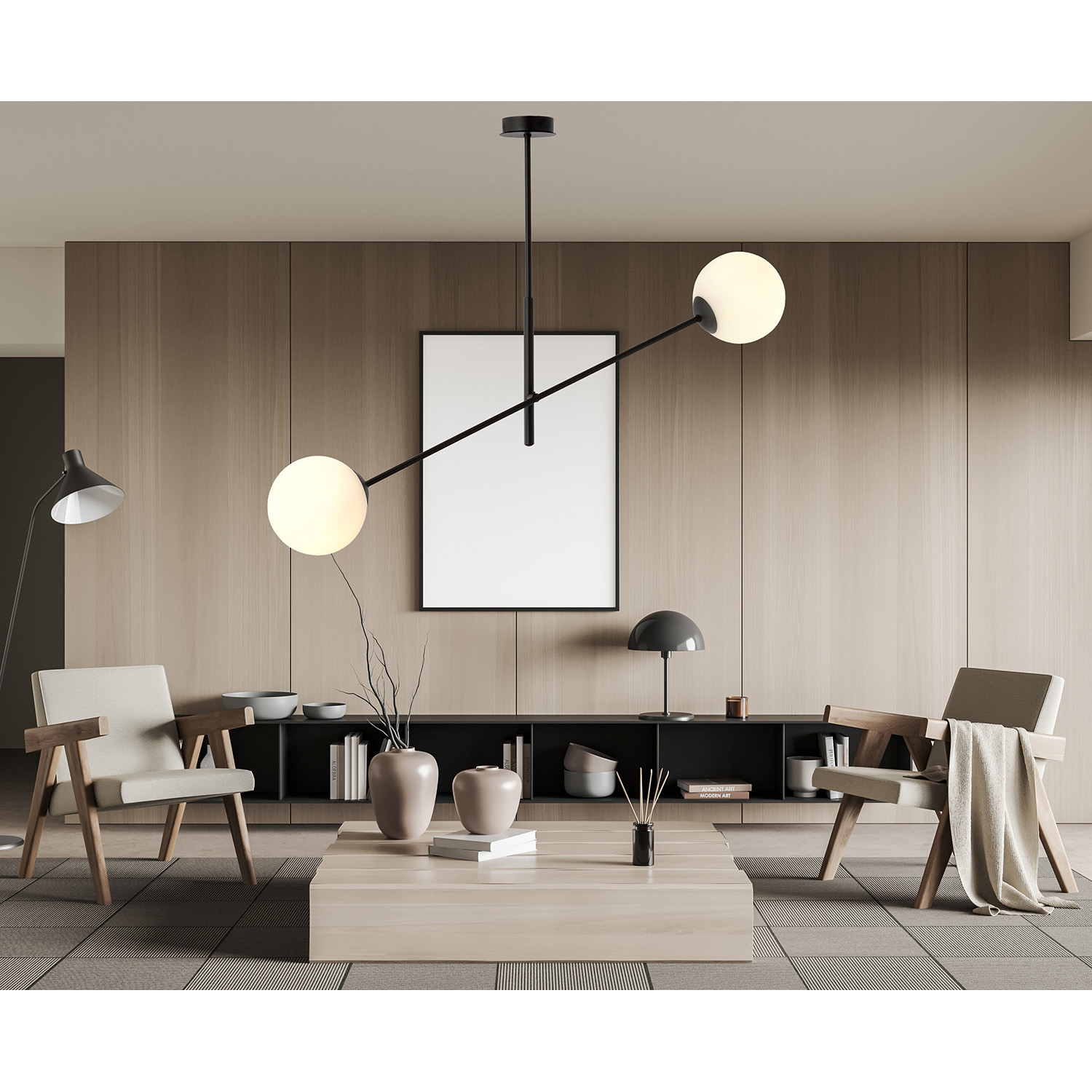 Lampadario 2 luci realizzato con base in metallo di colore nero con bracci dritti regolabili e due paralumi sferici in vetro di colore opale. Sta benissimo sopra un tavolo o un'isola, creando un'atmosfera unica. Le delicate tonalità del vetro aggiungono eleganza e leggerezza. Il design minimalista delle lampade LINEAR illumina con efficacia grandi superfici e si integra perfettamente con diverse disposizioni.