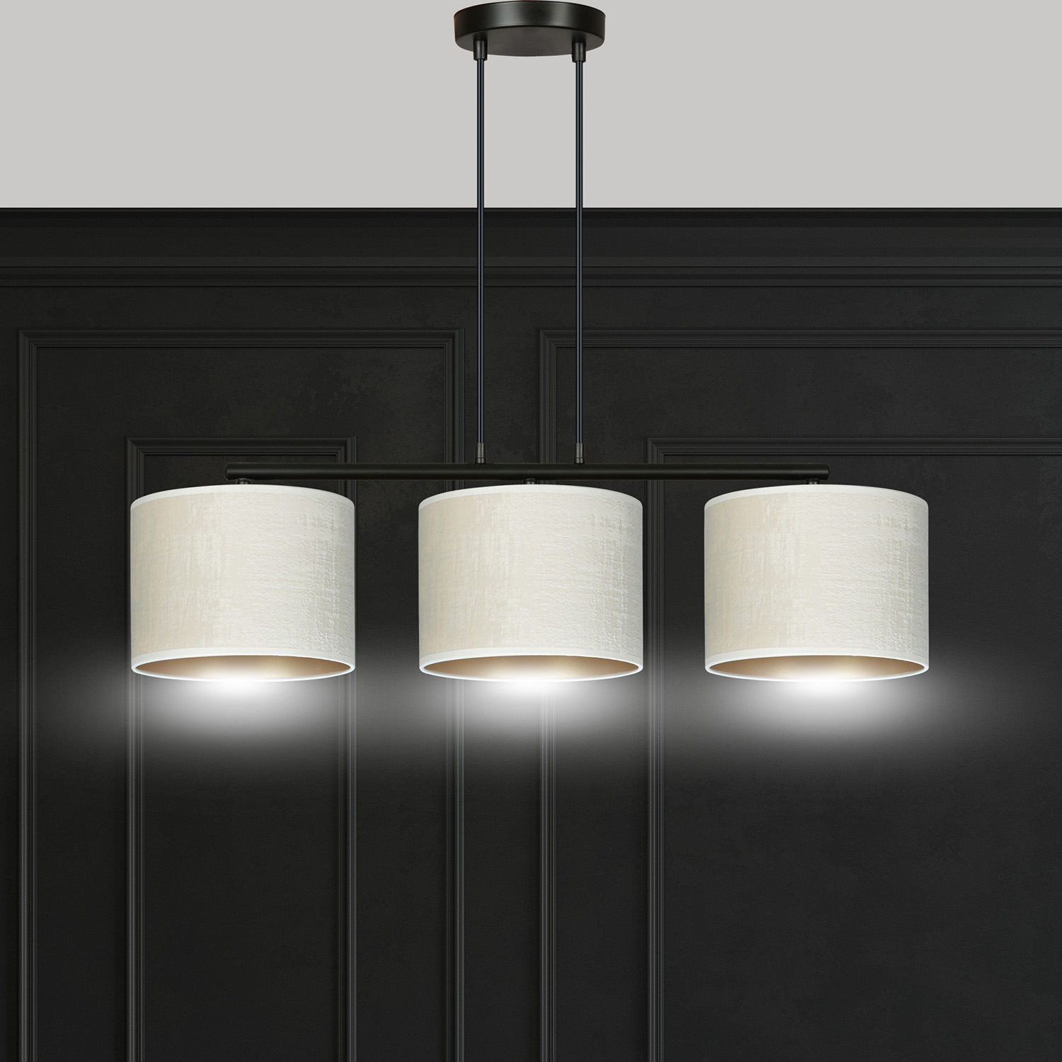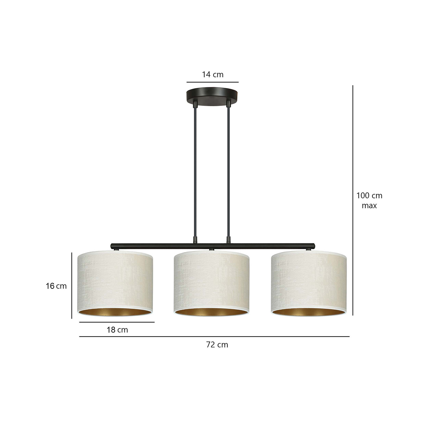 Lampadario 3 luci realizzato con base in acciaio tondo nero con braccio e 3 paralumi tessili a cilindro di colore beige all'esterno e dorati all'interno. La lunghezza regolabile dei cavi consente la personalizzazione in base alle esigenze individuali. I paralumi sono realizzati in materiale resistente con una texture vellutata e un centro dorato. La struttura semplice e l'elegante combinazione di colori lo rendono una scelta versatile per vari spazi.
