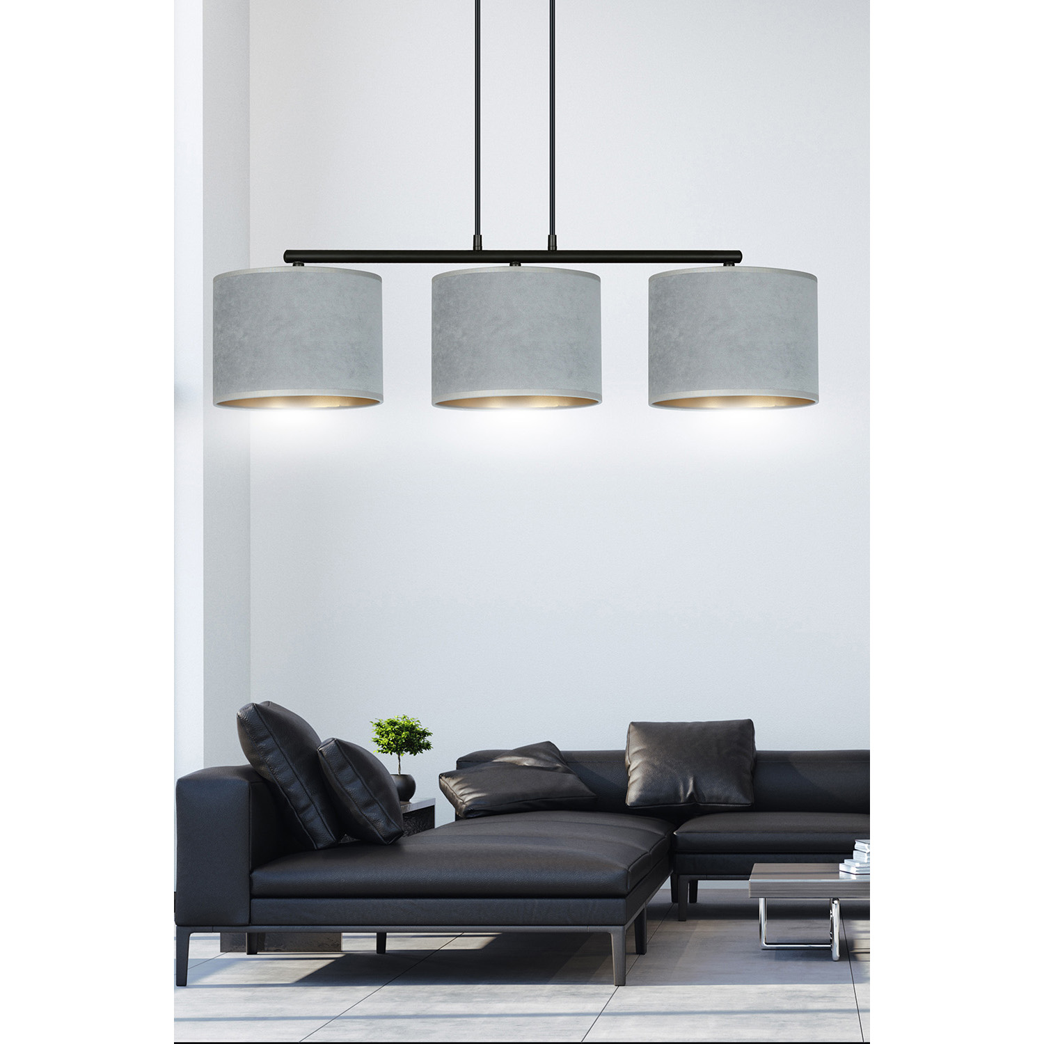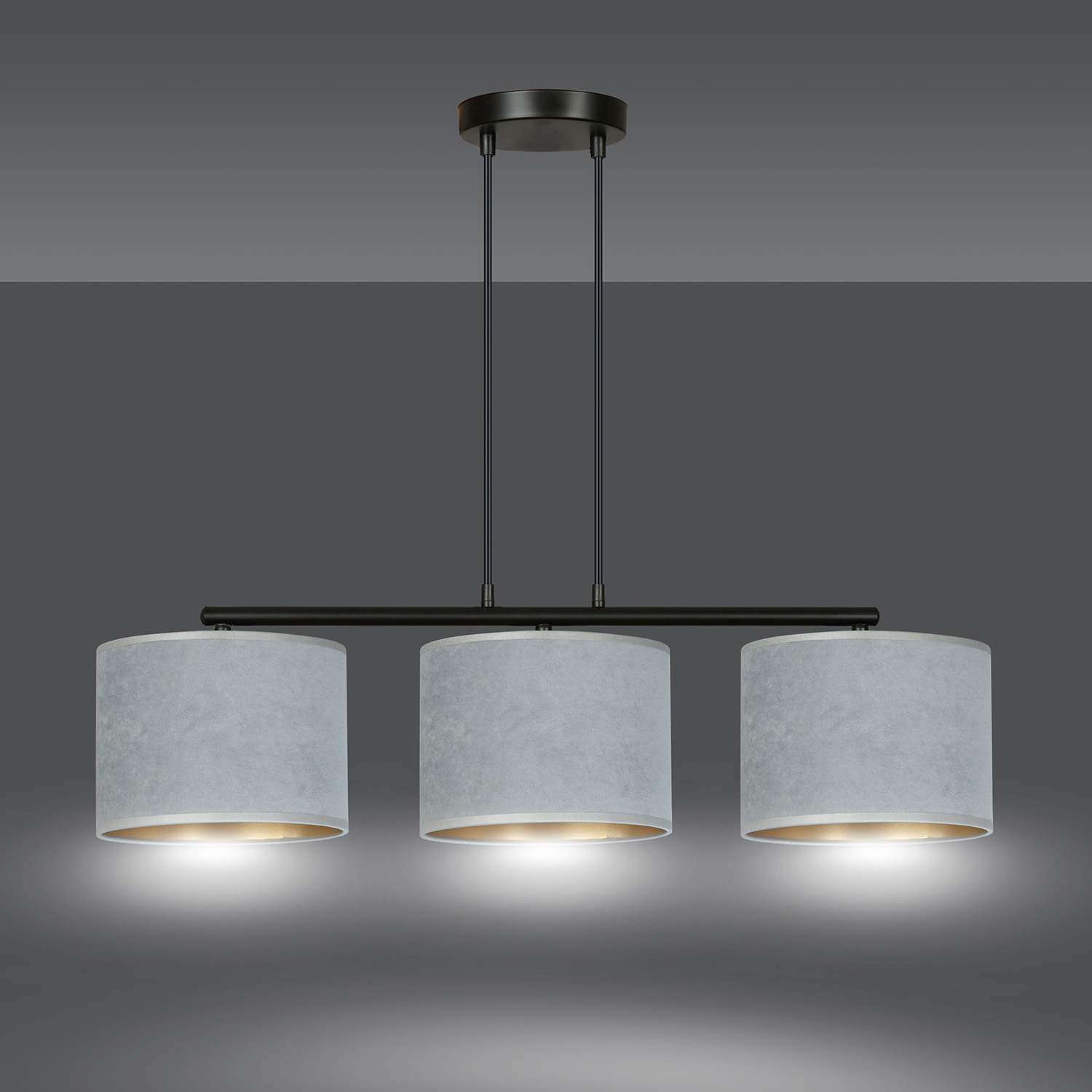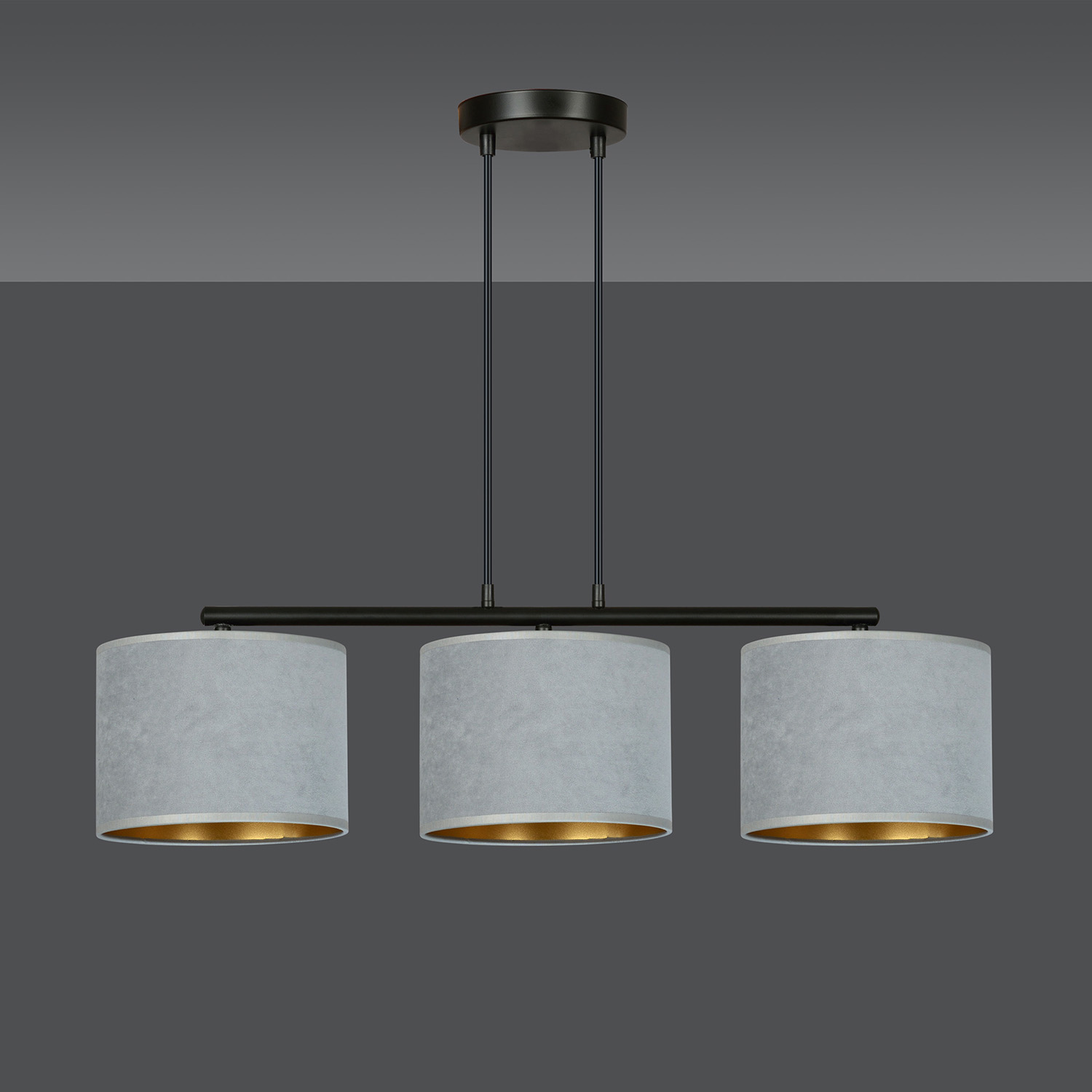 Lampadario 3 luci realizzato con base in acciaio tondo nero con braccio e 3 paralumi tessili di forma cilindrica grigi all'esterno e dorati all'interno. La lunghezza regolabile dei cavi consente la personalizzazione in base alle esigenze individuali. I paralumi sono realizzati in materiale resistente con una texture vellutata e un centro dorato. La struttura semplice e l'elegante combinazione di colori lo rendono una scelta versatile per vari spazi.