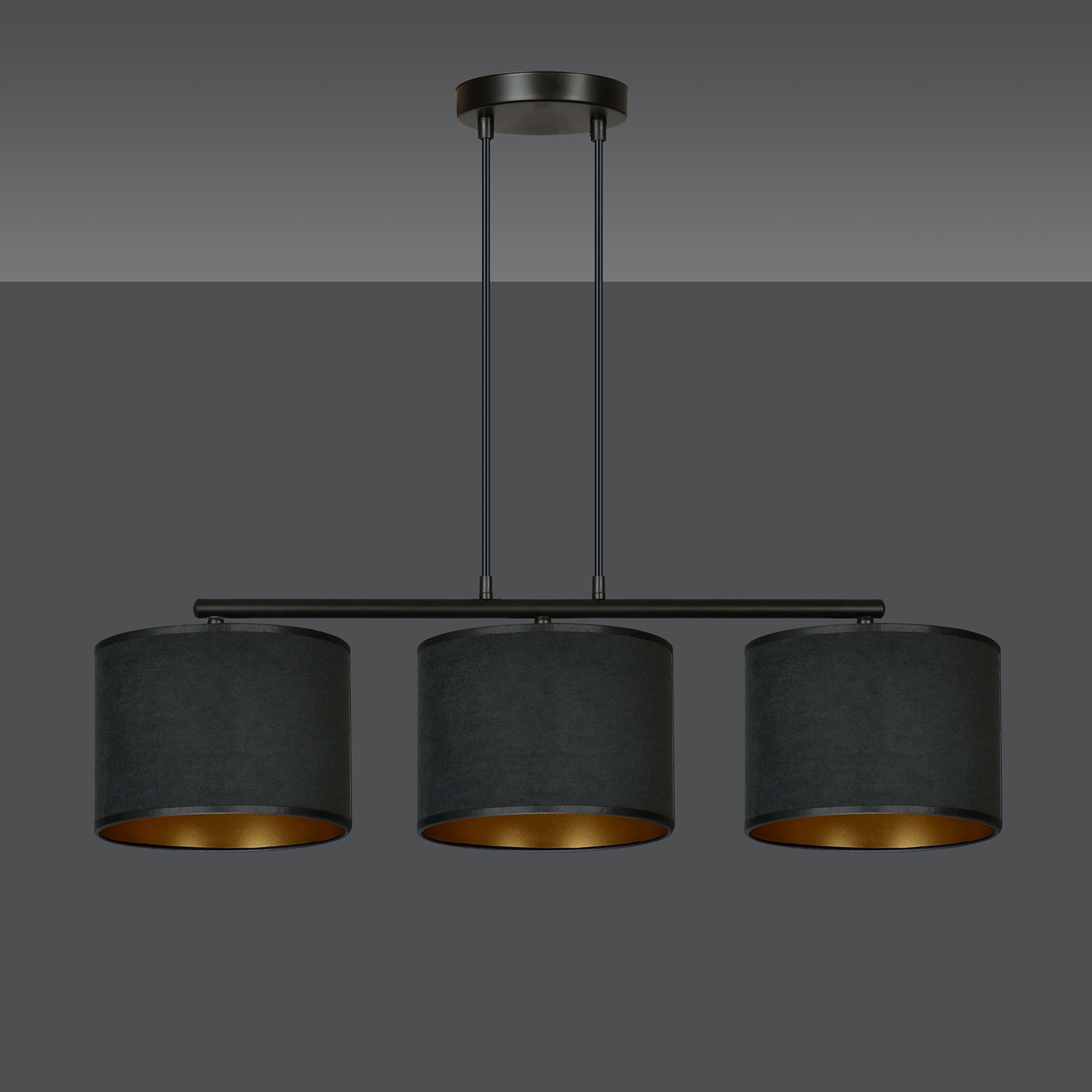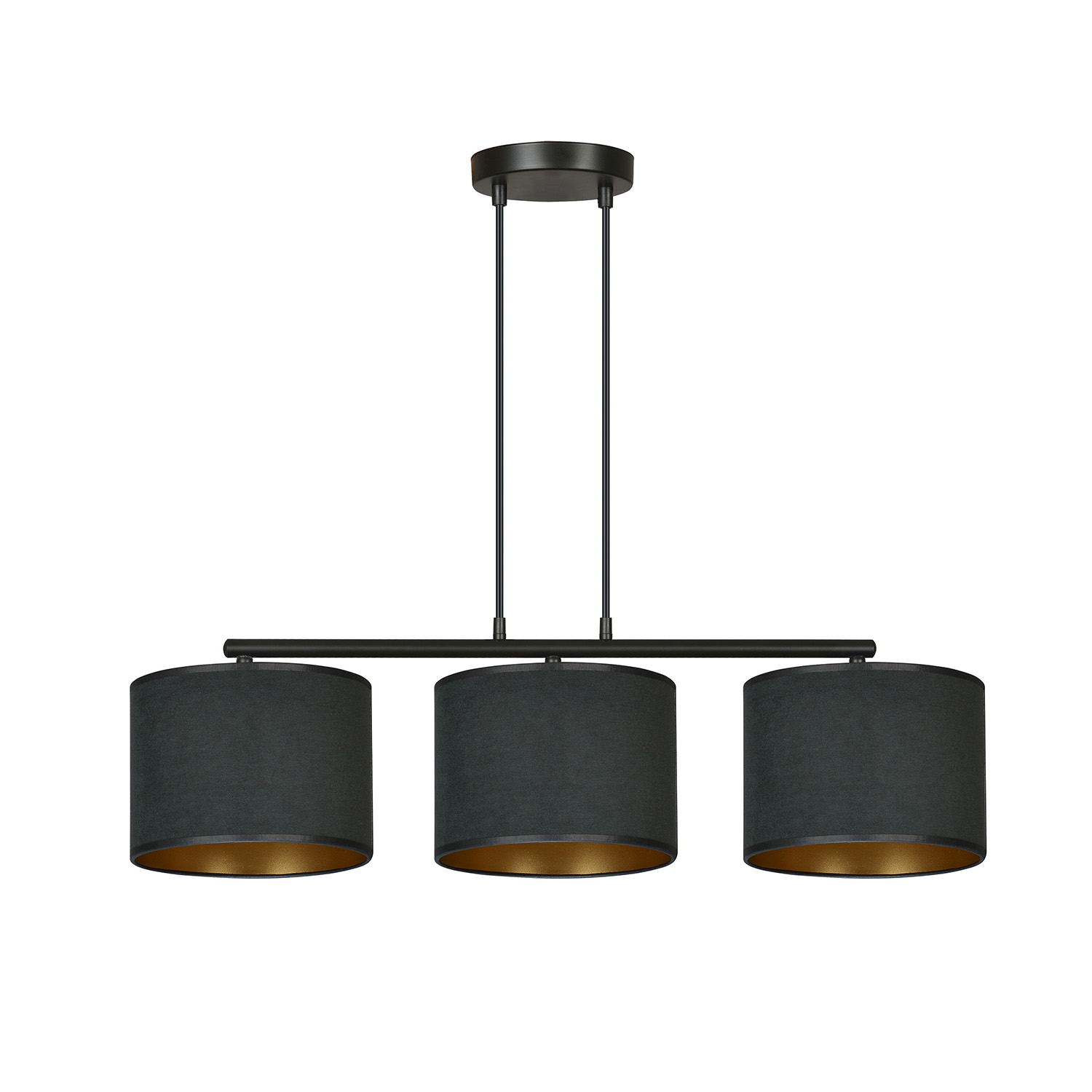 Lampadario 3 luci realizzato con base in acciaio tondo nero con braccio e 3 paralumi tessili a cilindro di colore nero all'esterno e dorati all'interno. La lunghezza regolabile dei cavi consente la personalizzazione in base alle esigenze individuali. I paralumi sono realizzati in materiale resistente con una texture vellutata e un centro dorato. La struttura semplice e l'elegante combinazione di colori lo rendono una scelta versatile per vari spazi.