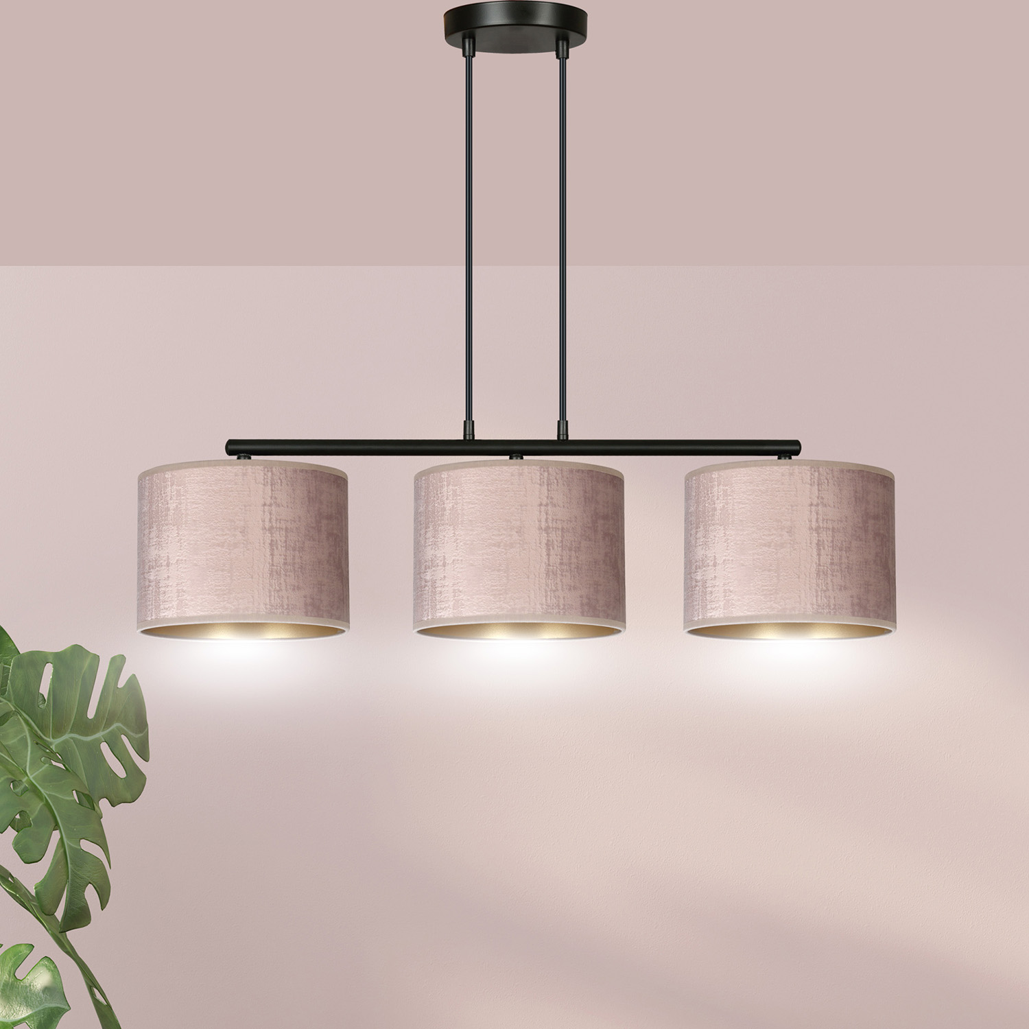 Lampadario 3 luci realizzato con base in acciaio tondo nero con braccio e 3 paralumi tessili a cilindro di colore rosa all'esterno e dorati all'interno. La lunghezza regolabile dei cavi consente la personalizzazione in base alle esigenze individuali. I paralumi sono realizzati in materiale resistente con una texture vellutata e un centro dorato. La struttura semplice e l'elegante combinazione di colori lo rendono una scelta versatile per vari spazi.