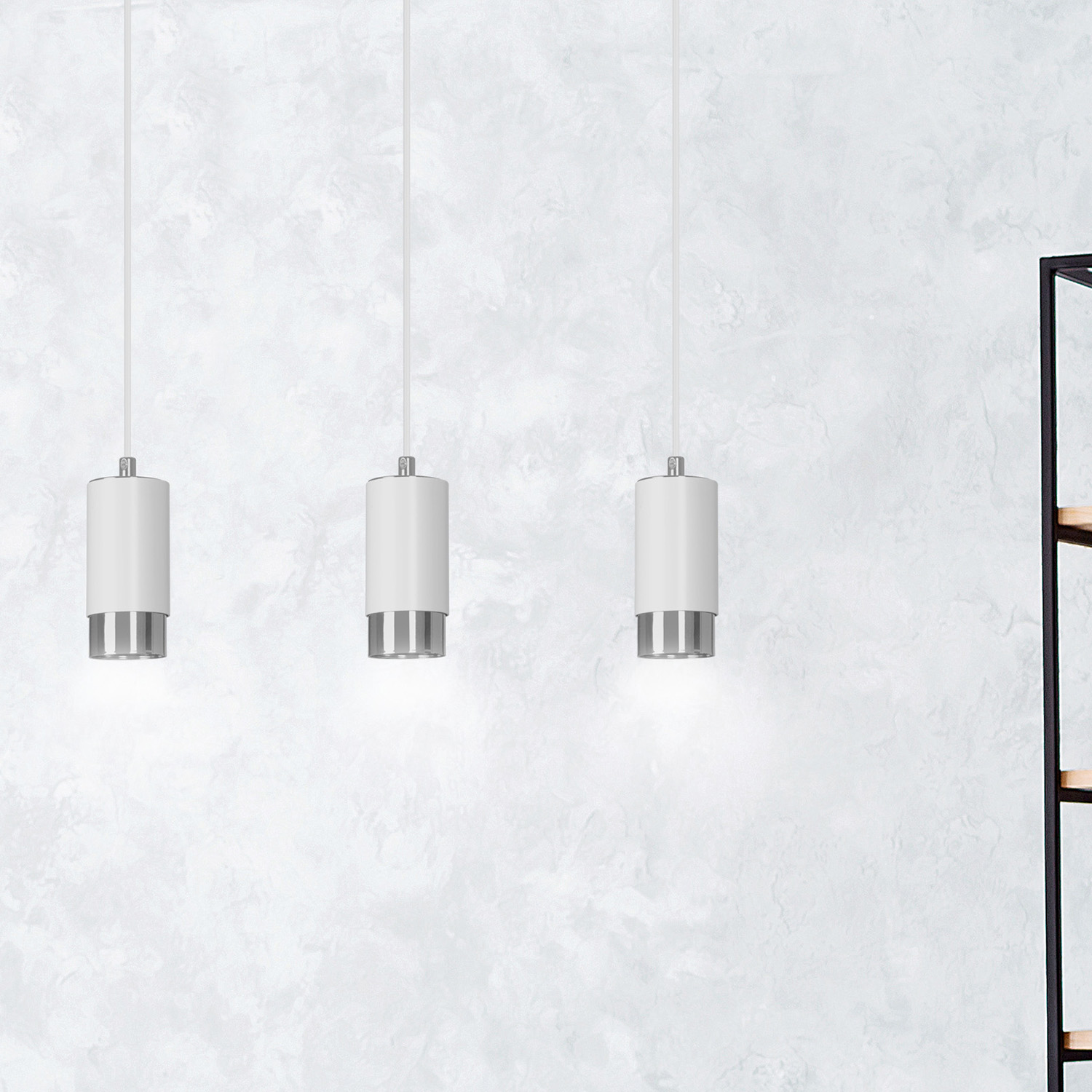 Lampadario 3 luci realizzato con base rettangolare in acciaio bianco e tre paralumi cilindrici in metallo bianco con dettagli decorativi in colore cromo. Realizzato in metallo, è disponibile in bianco o nero con accenti dorati o cromati. Si adatta perfettamente a tutti i tipi di interni ed è una soluzione ideale per il soggiorno, la cucina o l'ufficio domestico.