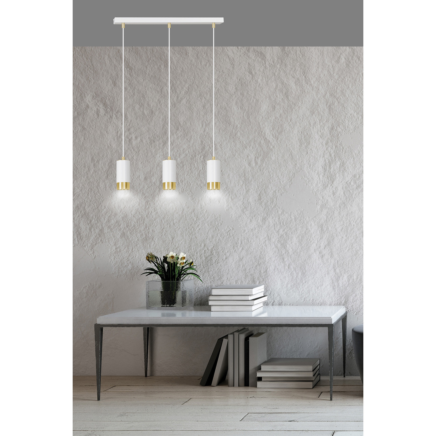 Lampadario 3 luci realizzato con base rettangolare in acciaio bianco e tre paralumi cilindrici in metallo bianco con dettagli decorativi in colore oro. Realizzato in metallo, è disponibile in bianco o nero con accenti dorati o cromati. Si adatta perfettamente a tutti i tipi di interni ed è una soluzione ideale per il soggiorno, la cucina o l'ufficio domestico.