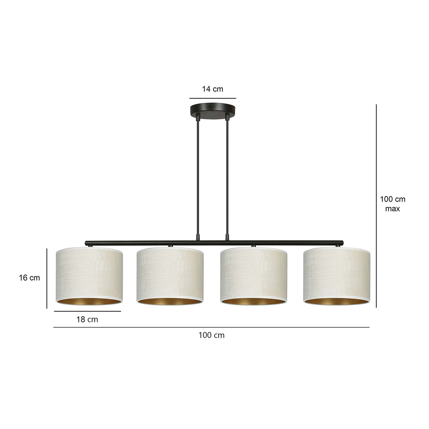 Lampadario 4 luci realizzato con base in acciaio tondo nero con braccio e 4 paralumi tessili a cilindro di colore beige all'esterno e dorati all'interno. La lunghezza regolabile dei cavi consente la personalizzazione in base alle esigenze individuali. I paralumi sono realizzati in materiale resistente con una texture vellutata e un centro dorato. La struttura semplice e l'elegante combinazione di colori lo rendono una scelta versatile per vari spazi.