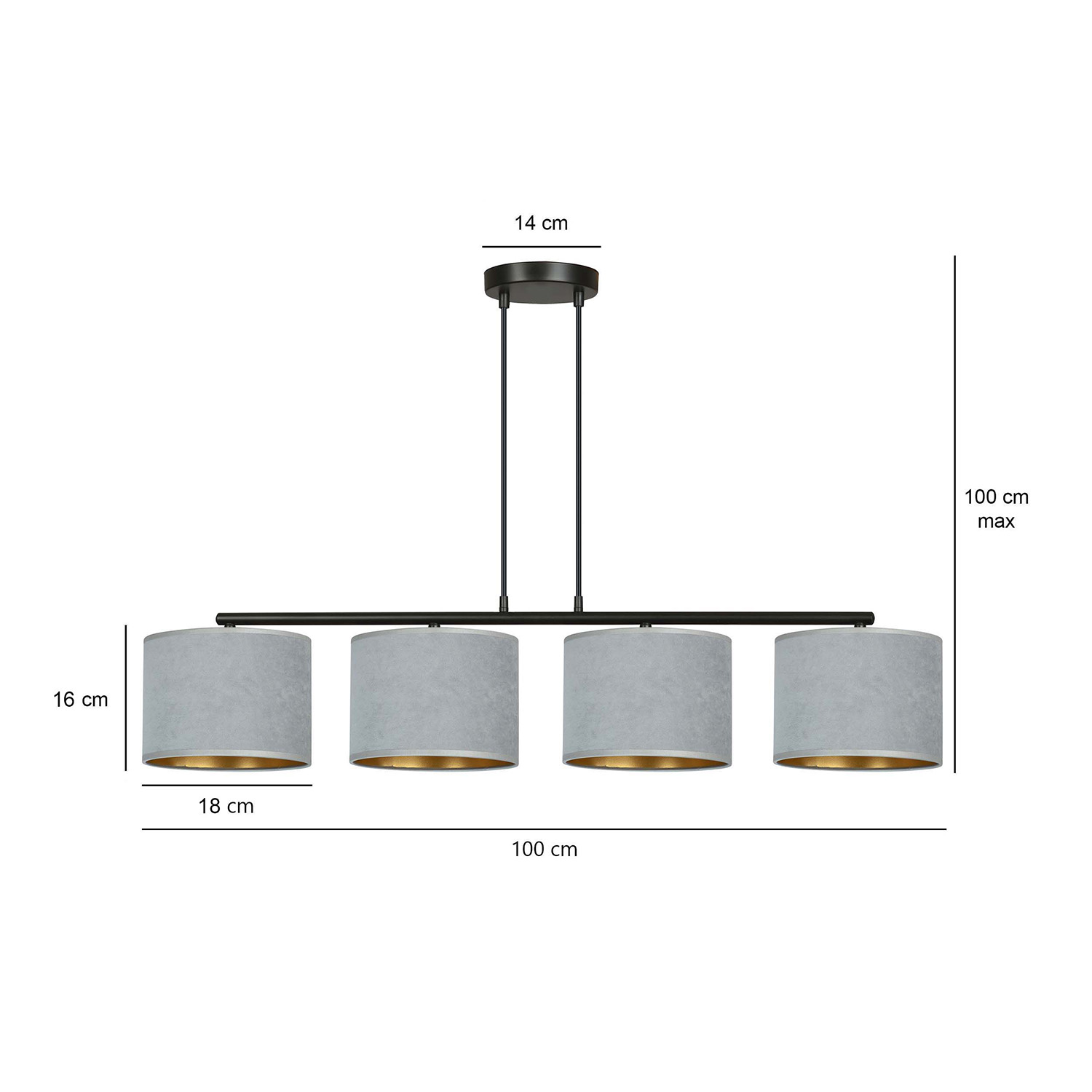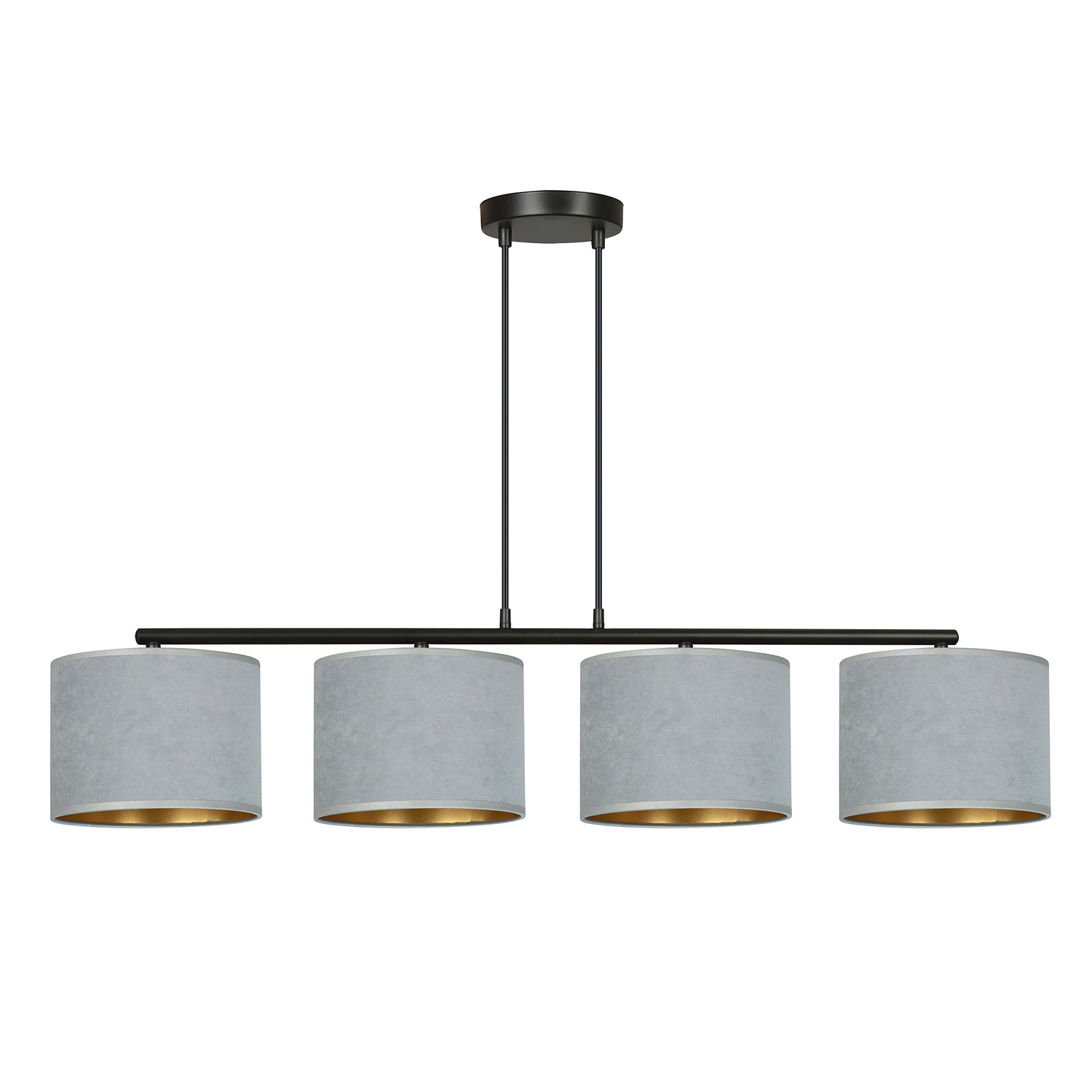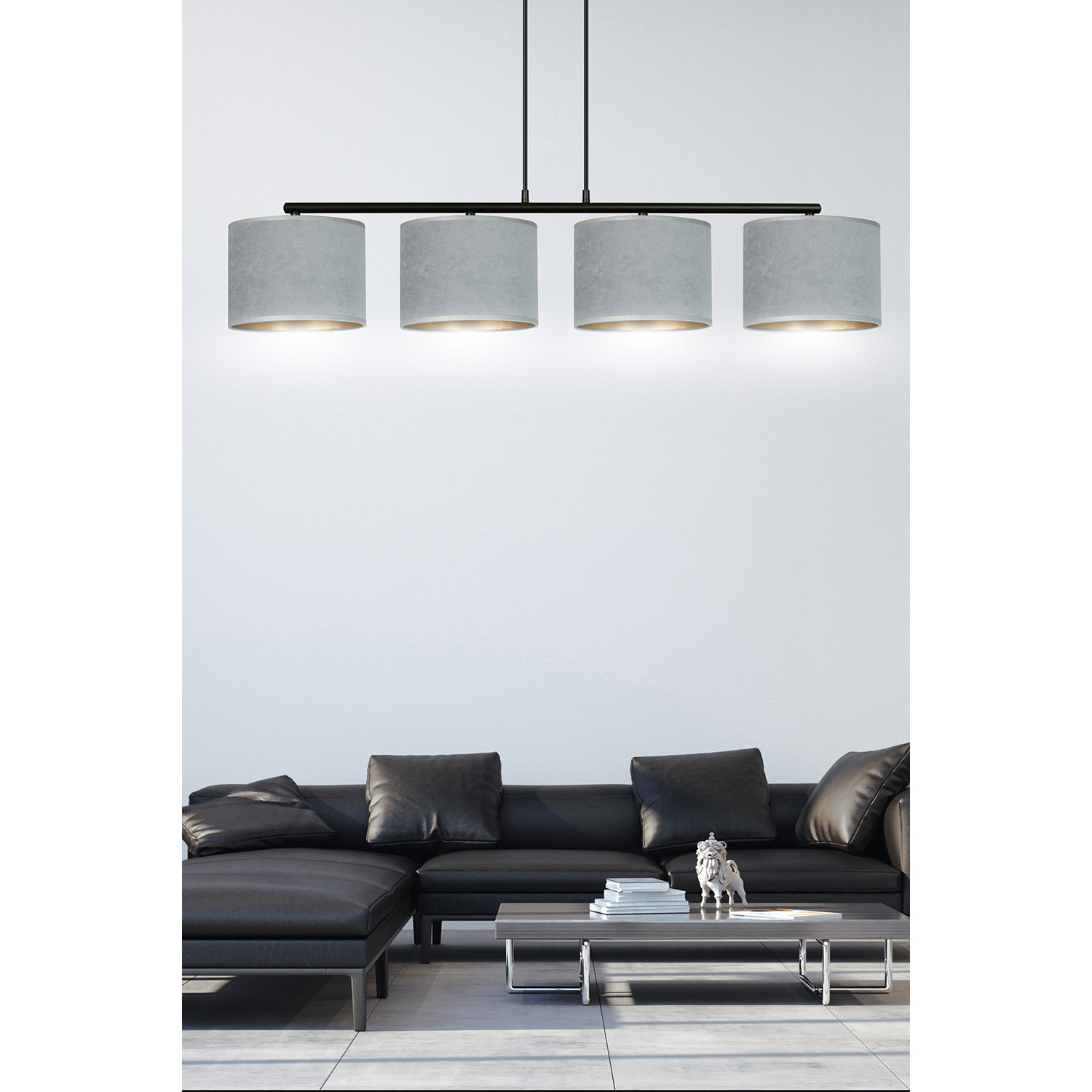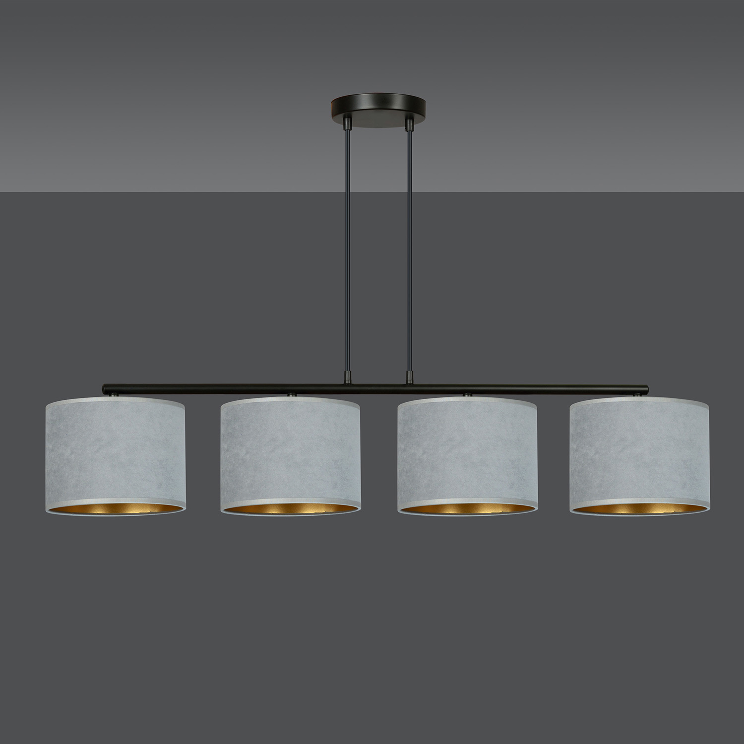 Lampadario 4 luci realizzato con base in acciaio tondo nero con braccio e 4 paralumi tessili di forma cilindrica grigi all'esterno e dorati all'interno. La lunghezza regolabile dei cavi consente la personalizzazione in base alle esigenze individuali. I paralumi sono realizzati in materiale resistente con una texture vellutata e un centro dorato. La struttura semplice e l'elegante combinazione di colori lo rendono una scelta versatile per vari spazi.