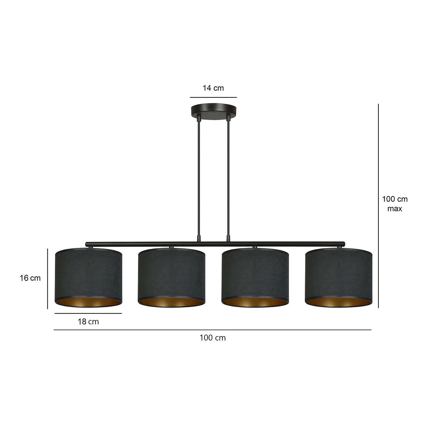 Lampadario 4 luci realizzato con base in acciaio tondo nero con braccio e 4 paralumi tessili a cilindro di colore nero all'esterno e dorati all'interno. La lunghezza regolabile dei cavi consente la personalizzazione in base alle esigenze individuali. I paralumi sono realizzati in materiale resistente con una texture vellutata e un centro dorato. La struttura semplice e l'elegante combinazione di colori lo rendono una scelta versatile per vari spazi.