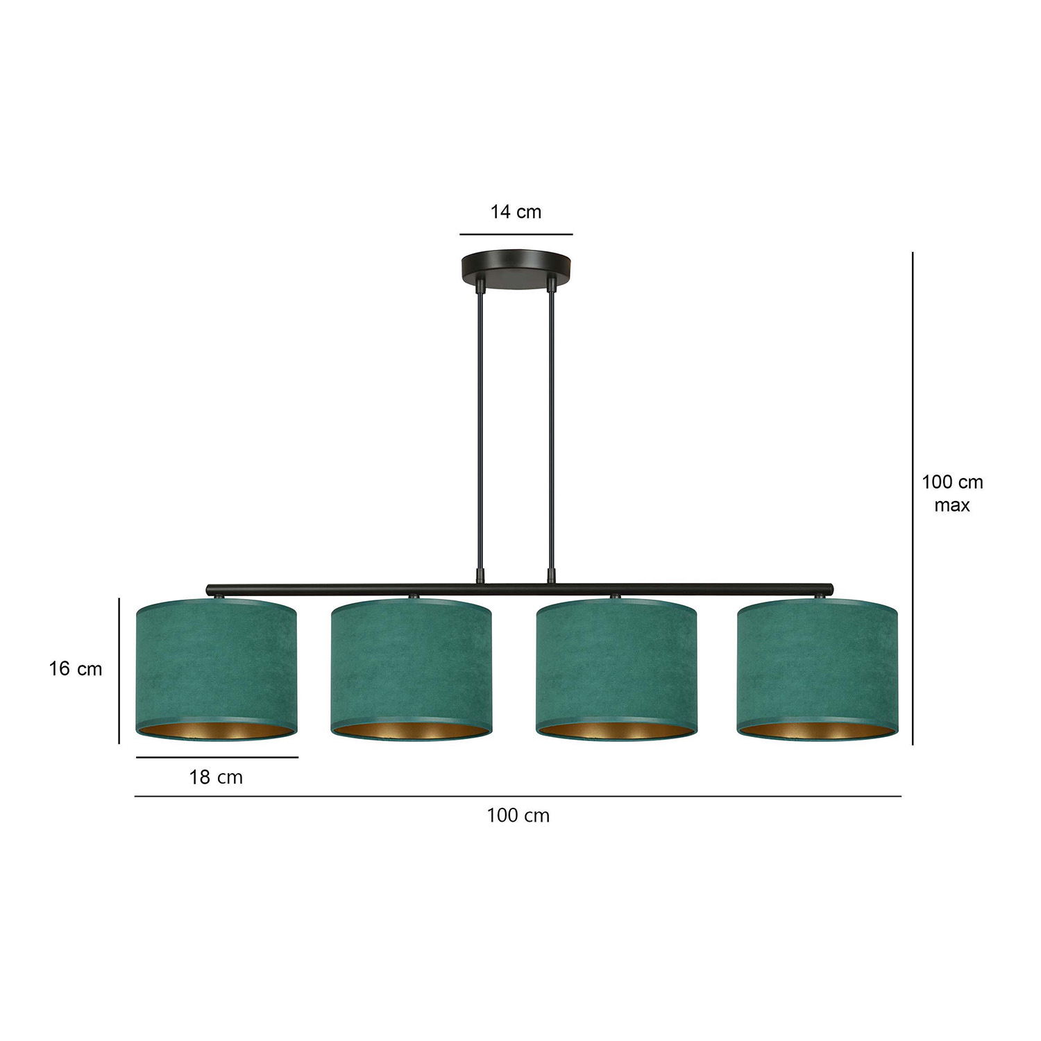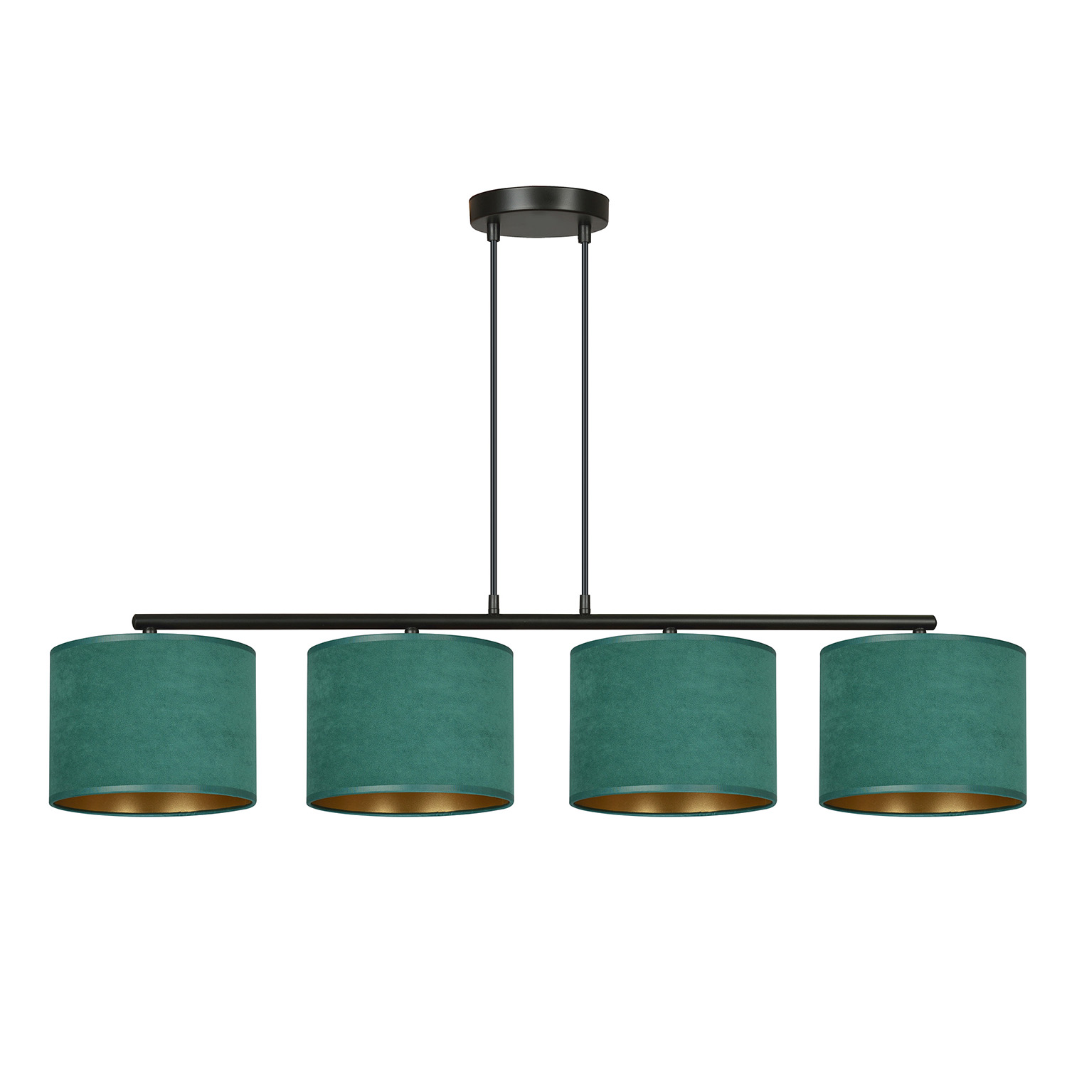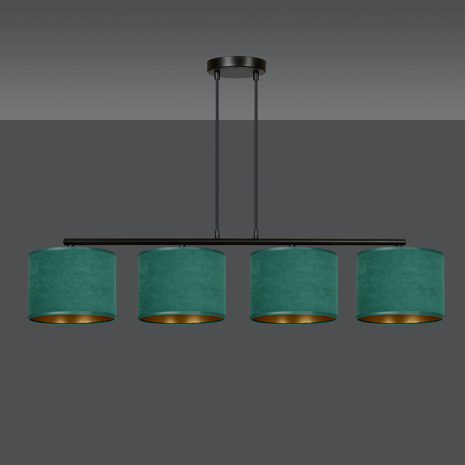 Lampadario 4 luci realizzato con base in acciaio tondo nero con braccio e 4 paralumi tessili a cilindro di colore verde all'esterno e dorati all'interno. La lunghezza regolabile dei cavi consente la personalizzazione in base alle esigenze individuali. I paralumi sono realizzati in materiale resistente con una texture vellutata e un centro dorato. La struttura semplice e l'elegante combinazione di colori lo rendono una scelta versatile per vari spazi.