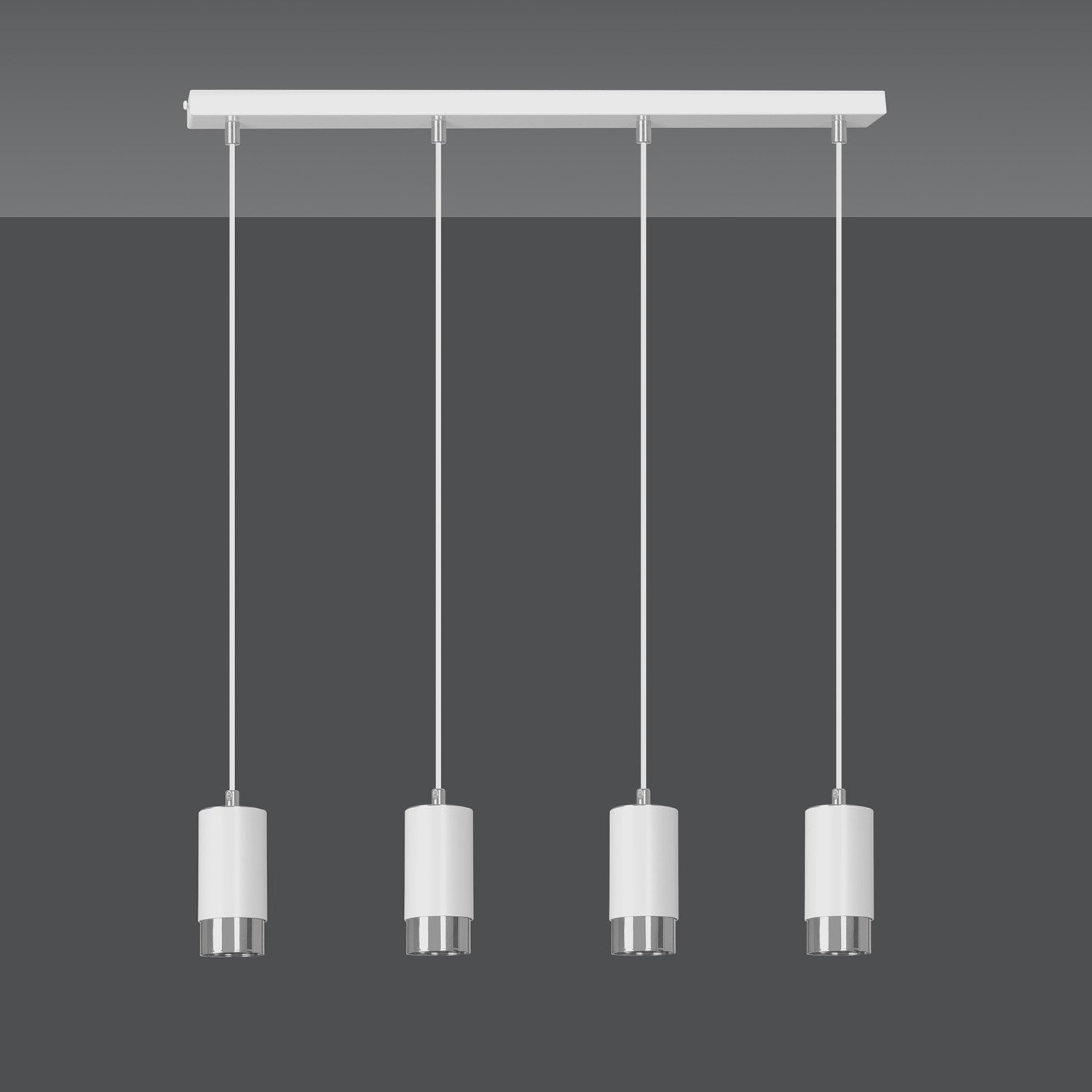 Lampadario 4 luci realizzato con base rettangolare in acciaio bianco e quattro paralumi cilindrici in metallo bianco con dettagli decorativi in colore cromo. Realizzato in metallo, è disponibile in bianco o nero con accenti dorati o cromati. Si adatta perfettamente a tutti i tipi di interni ed è una soluzione ideale per il soggiorno, la cucina o l'ufficio domestico.
