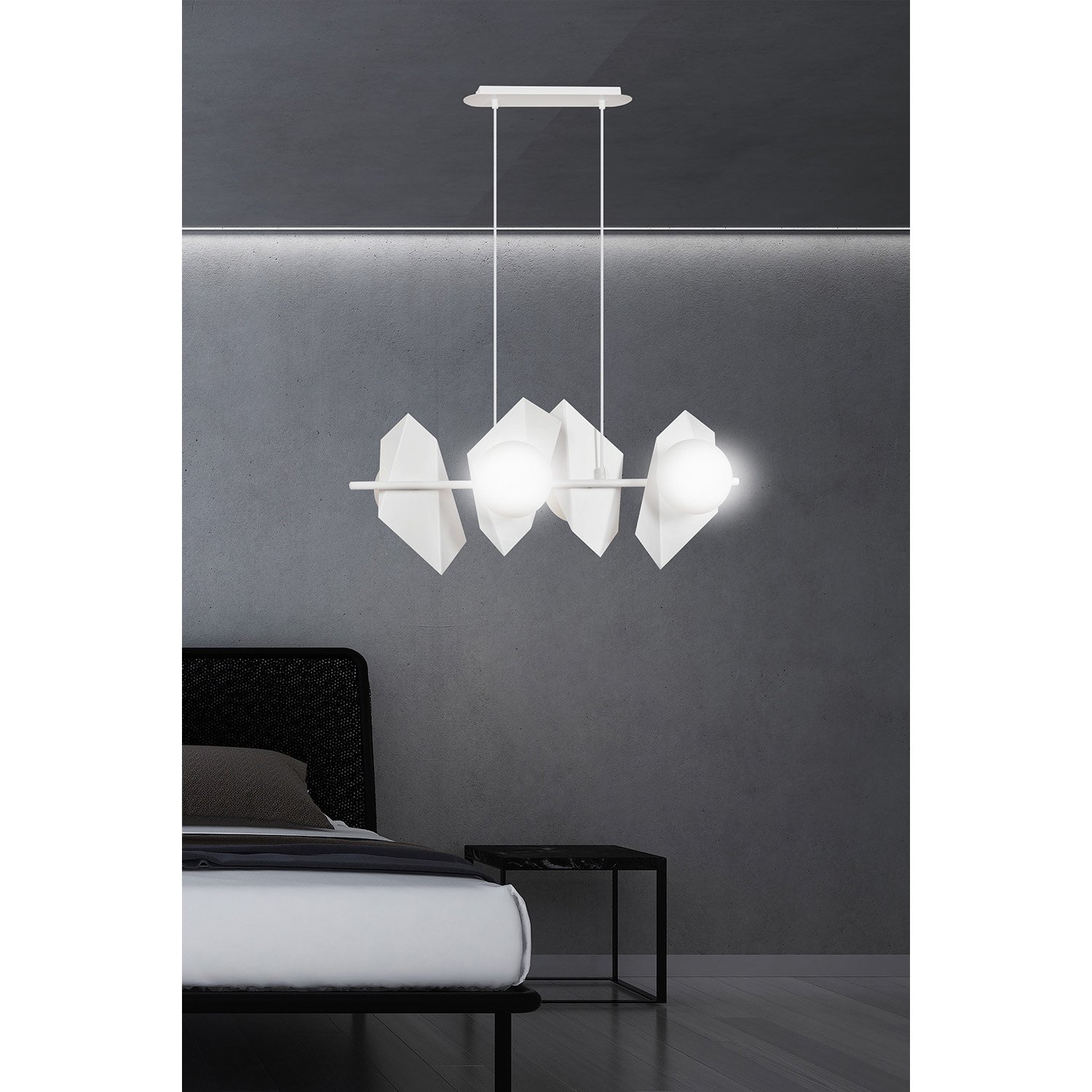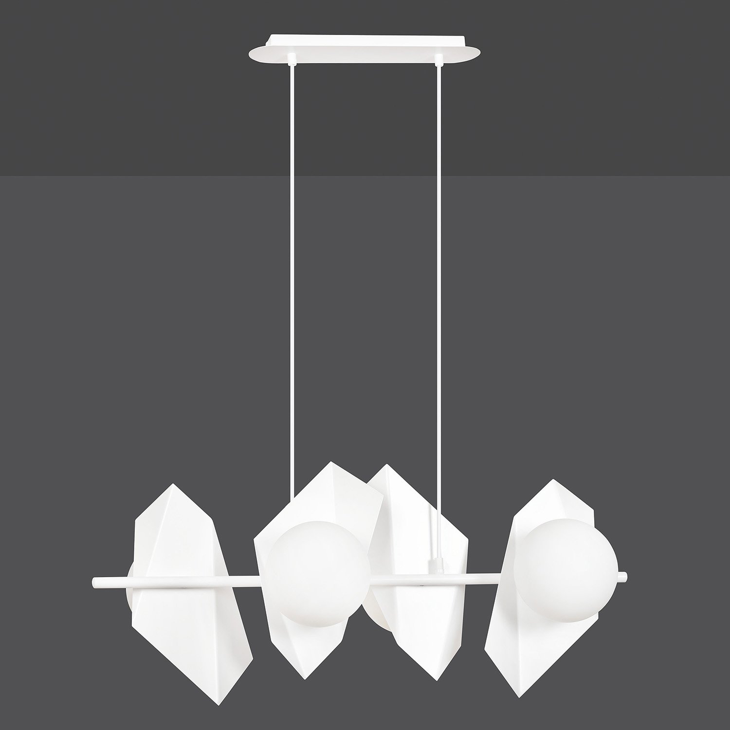 Lampadario 4 luci realizzato con base e braccio in metallo di colore bianco con 4 diffusori poligonali in metallo e paralumi sferici in vetro opalino. La sua struttura geometrica in metallo attira l'attenzione e offre una soluzione unica per chi cerca elementi decorativi interessanti per i propri interni.