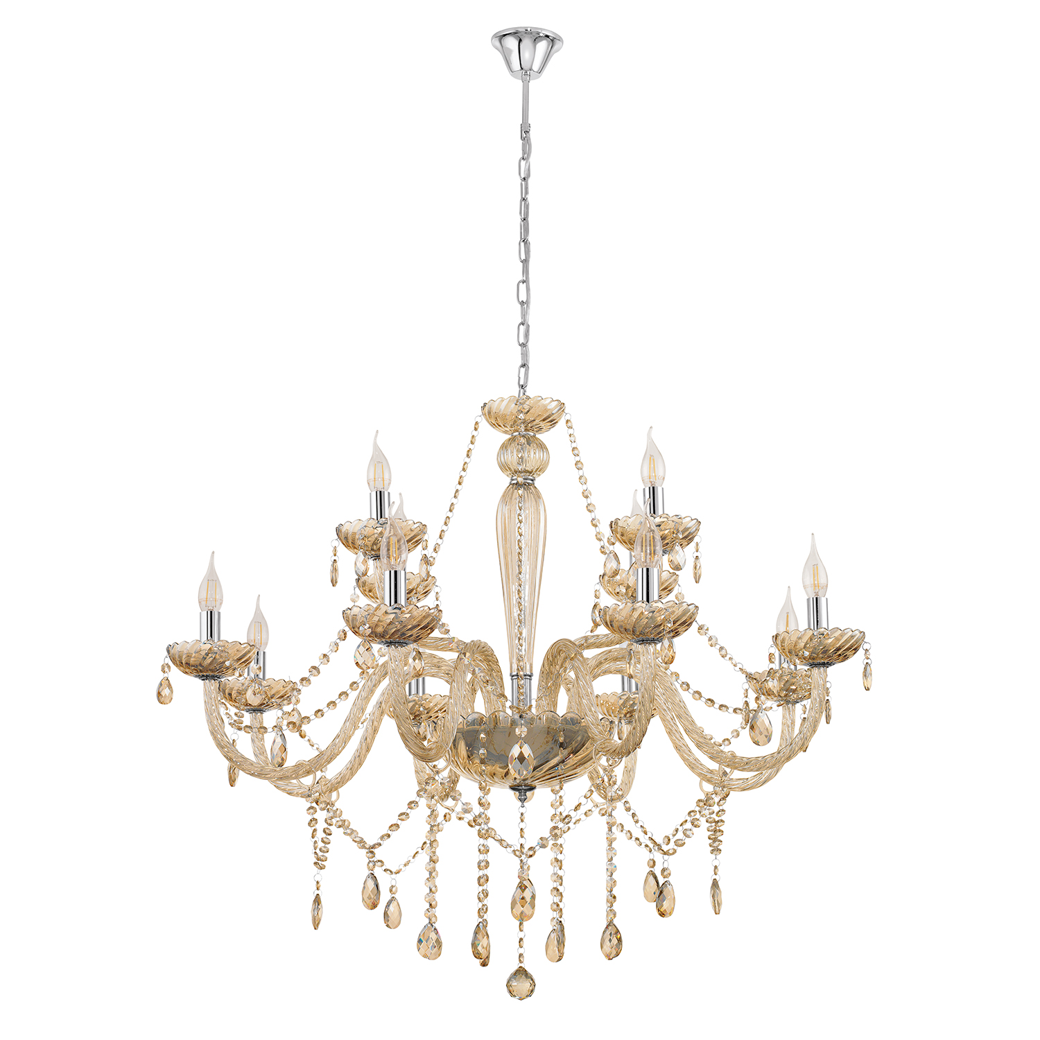 BASILANO - Il lampadario a sospensione monta portalampada E14 12X40W con Struttura in acciaio / finitura cromo; Diffusore in vetro / finitura cognac. Ø1000 H1500