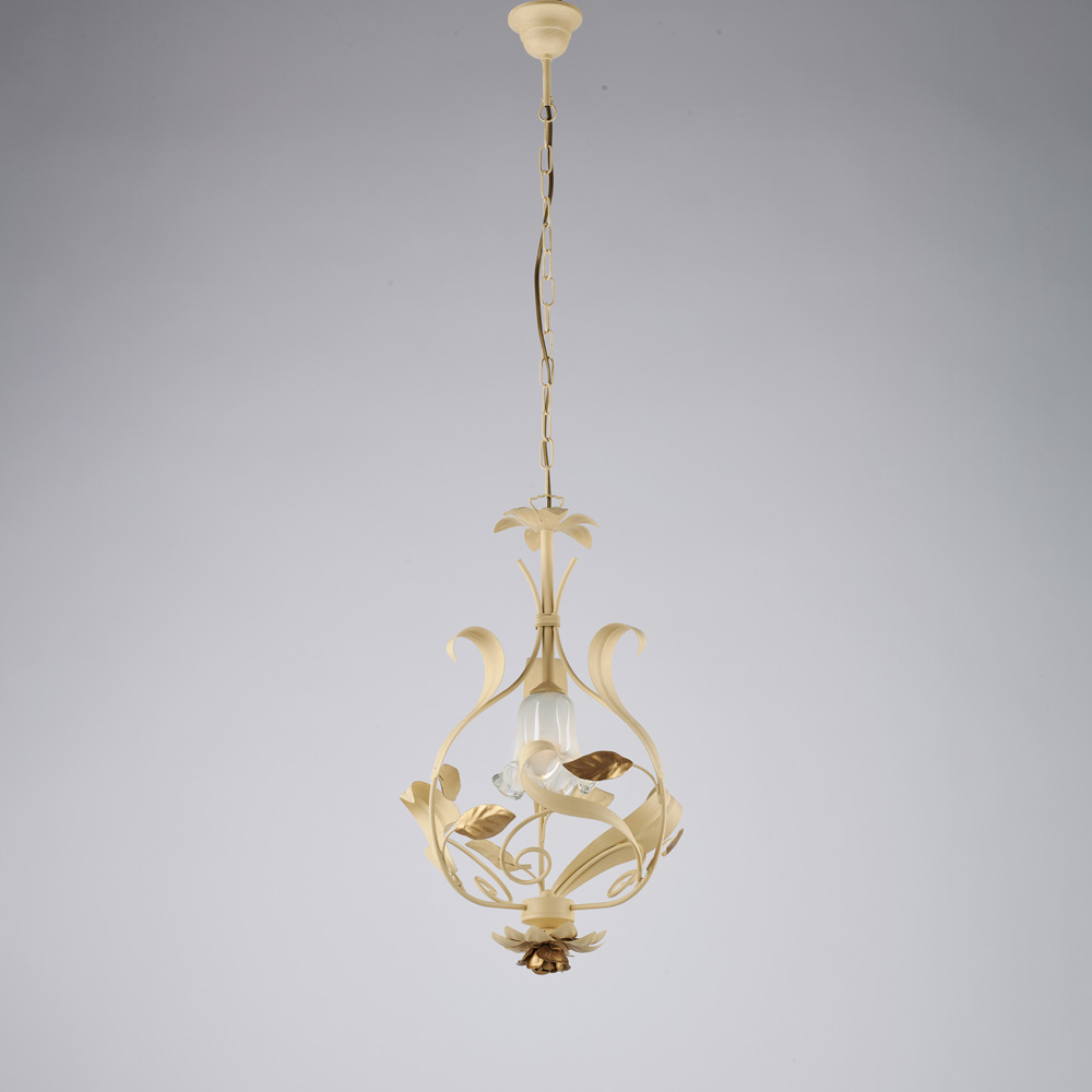 Sospensione in ferro laccato avorio decapè con 1 luce.. Lampadario classico 1 luce in ferro laccato avorio con decorazioni decape e rifiniture oro, composto da una grande rosa e un fiore centrale alla base ed eleganti bracci decorati con foglie color oro, che circondano un diffusore di vetro in piastra lavorato a mano, color bianco. E' possibile modificare l'altezza del lampadario grazie alla catena regolabile, rendendo questa sospensione adattabile a tutti gli spazi. La serie CESTO, ispirata alle manifatture di una volta, regalerà ai vostri interni un'atmosfera tradizionale ma di classe. Il lampadario ha infatti un aspetto rustico e romantico, adatto a illuminare ambienti country e provenzali. Tutti i nostri articoli sono prodotti esclusivamente in Italia e rispettano rigorosamente le normative CE. Prodotti realizzati per la maggior parte dei casi senza l'ausilio delle macchine salvo qualche eccezione in cui, le stesse, sono utilizzate in modo marginale. Le piccole imperfezioni e le variazioni nelle misure sono, quindi, non da attribuirsi ad un difetto di fabbricazione quanto alla particolarità ed alla composizione stessa del prodotto interamente confezionato a mano. Essendo prodotti realizzati artigianalmente, su richiesta è possibile effettuare piccole modifiche o personalizzazioni al prodotto.