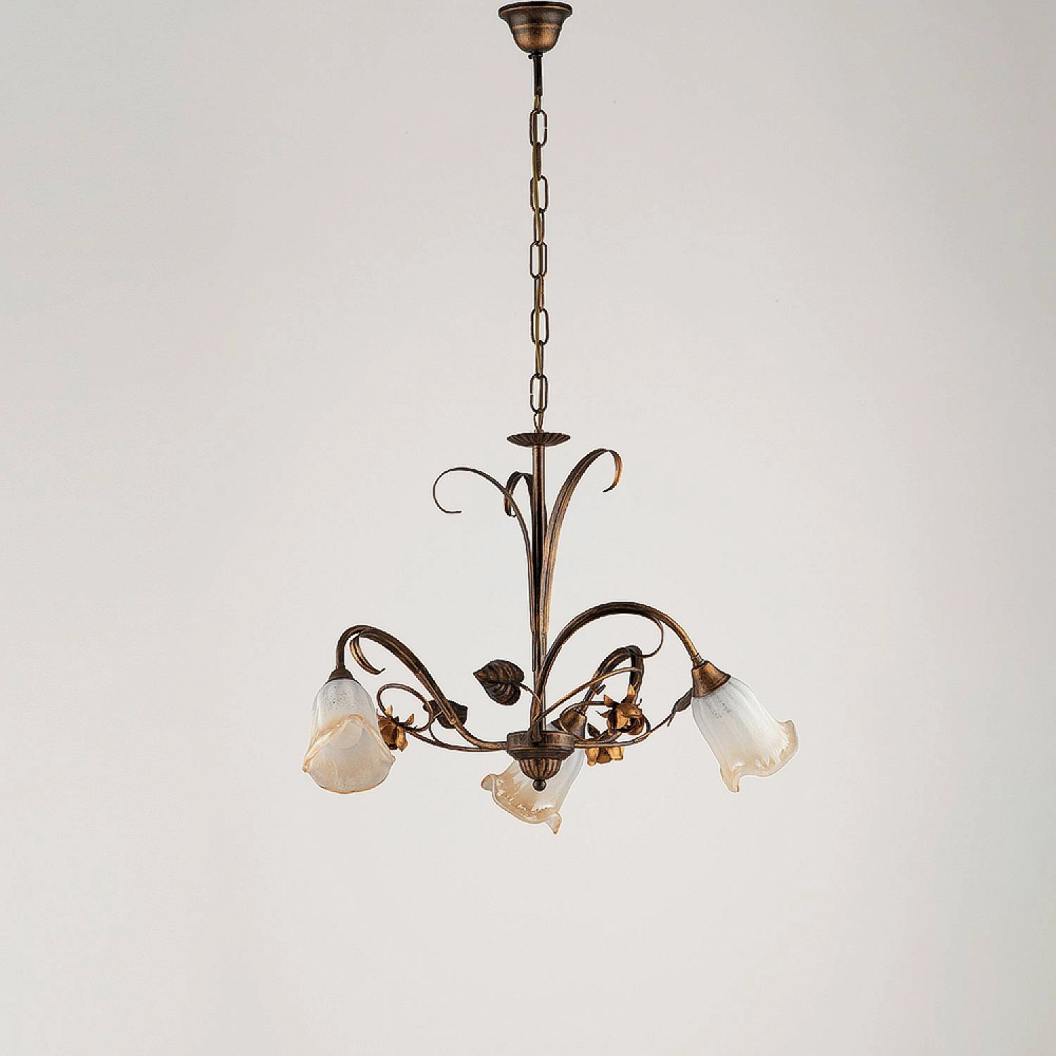 Lampadario 3 luci dallo stile classico in ferro laccato con pittura termoindurente marrone e decorazione oro ducale.. Diffusori in vetro bianchi e ambra con lampadine E14. Dotato di catena per regolarne l'altezza. Prodotto realizzato interamente a mano da Mastri Artigiani con materiali 100% Italiani.