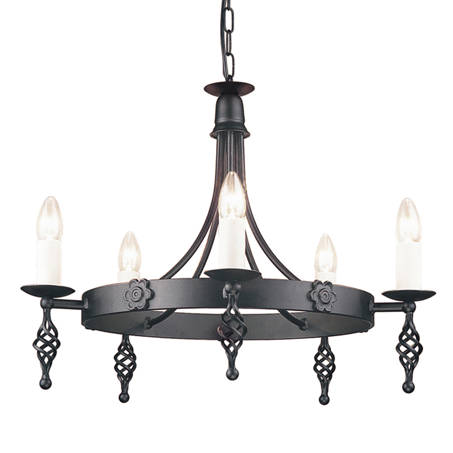 Lampadario a 5 luci. Un design tipicamente medievale, la collezione Belfry di lampade da parete, da soffitto e da tavolo offre il meglio della lavorazione artigianale del metallo. I lampadari possono essere facilmente convertiti a soffitto.