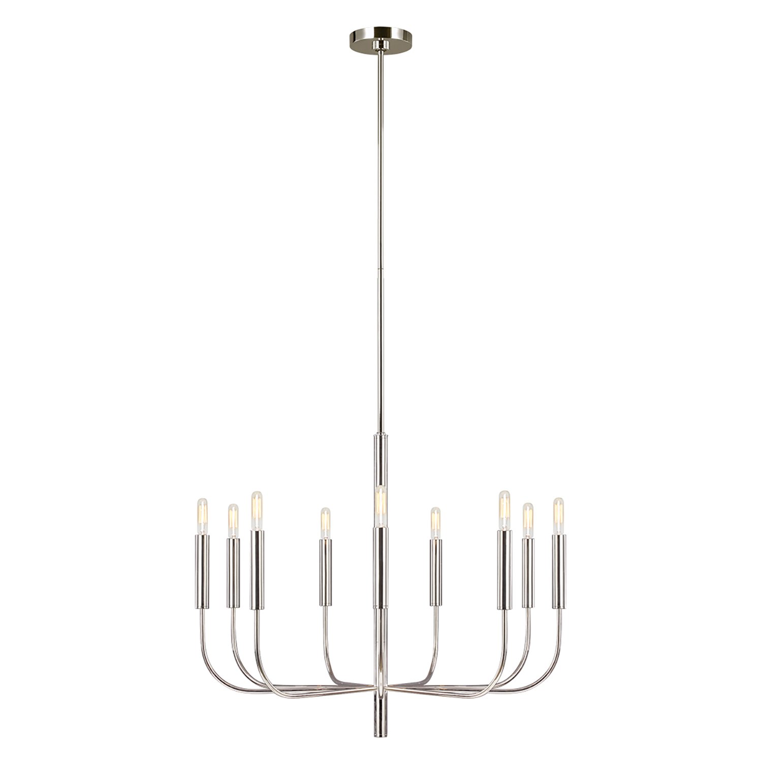Lampadario a 9 luci - Nichel lucido . La graziosa curvatura continua di Brianna e i lunghi bracci tubolari conferiscono fluidità e fascino moderno a questa classica silhouette minimalista. Disponibile nelle ricche finiture, ottone brunito dorato e in quella più contemporanea in nichel lucido. Le lampade a parete Brianna sono dotate di paralumi cilindrici in fresco lino bianco.