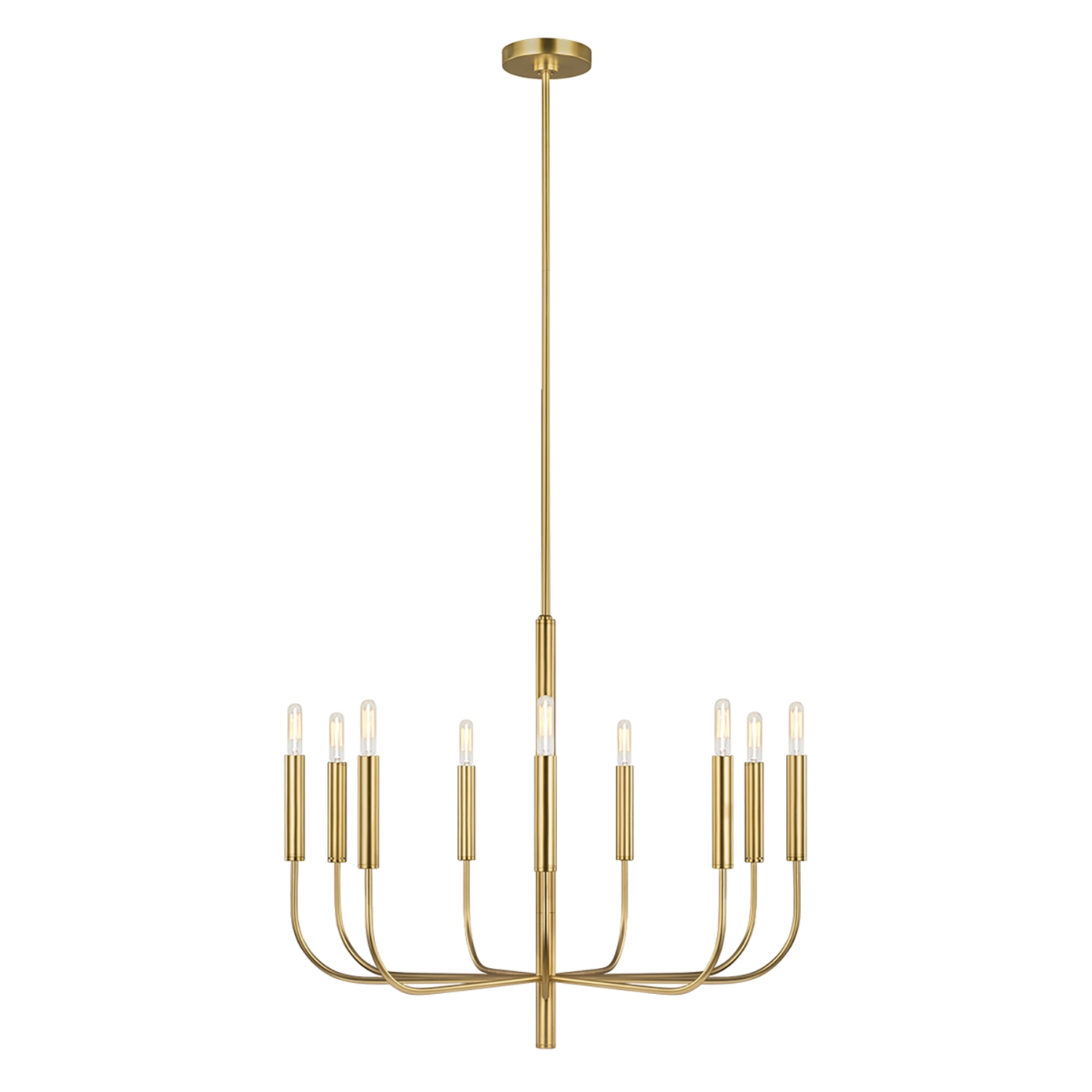 Lampadario a 9 luci - Ottone brunito . La graziosa curvatura continua di Brianna e i lunghi bracci tubolari conferiscono fluidità e fascino moderno a questa classica silhouette minimalista. Disponibile nelle ricche finiture, ottone brunito dorato e in quella più contemporanea in nichel lucido. Le lampade a parete Brianna sono dotate di paralumi cilindrici in fresco lino bianco.