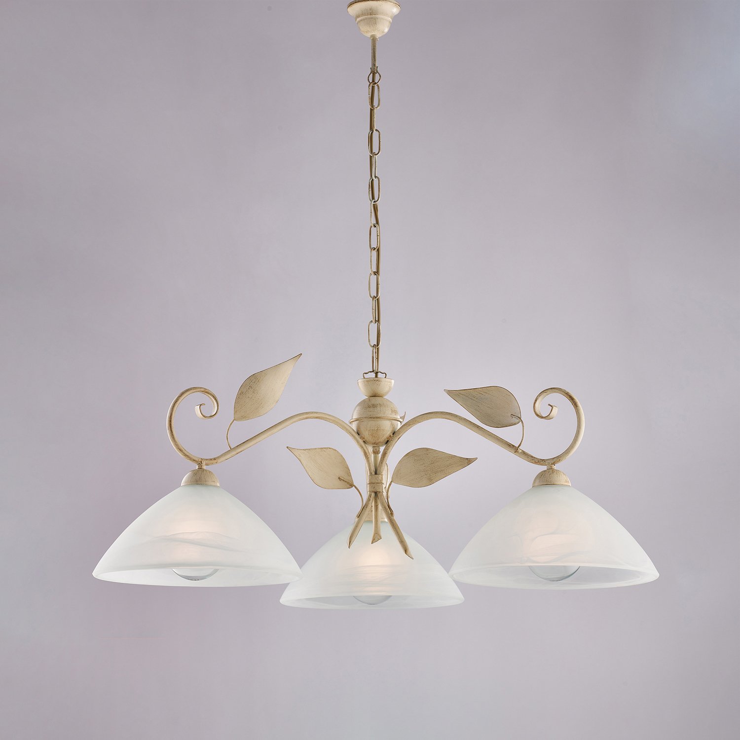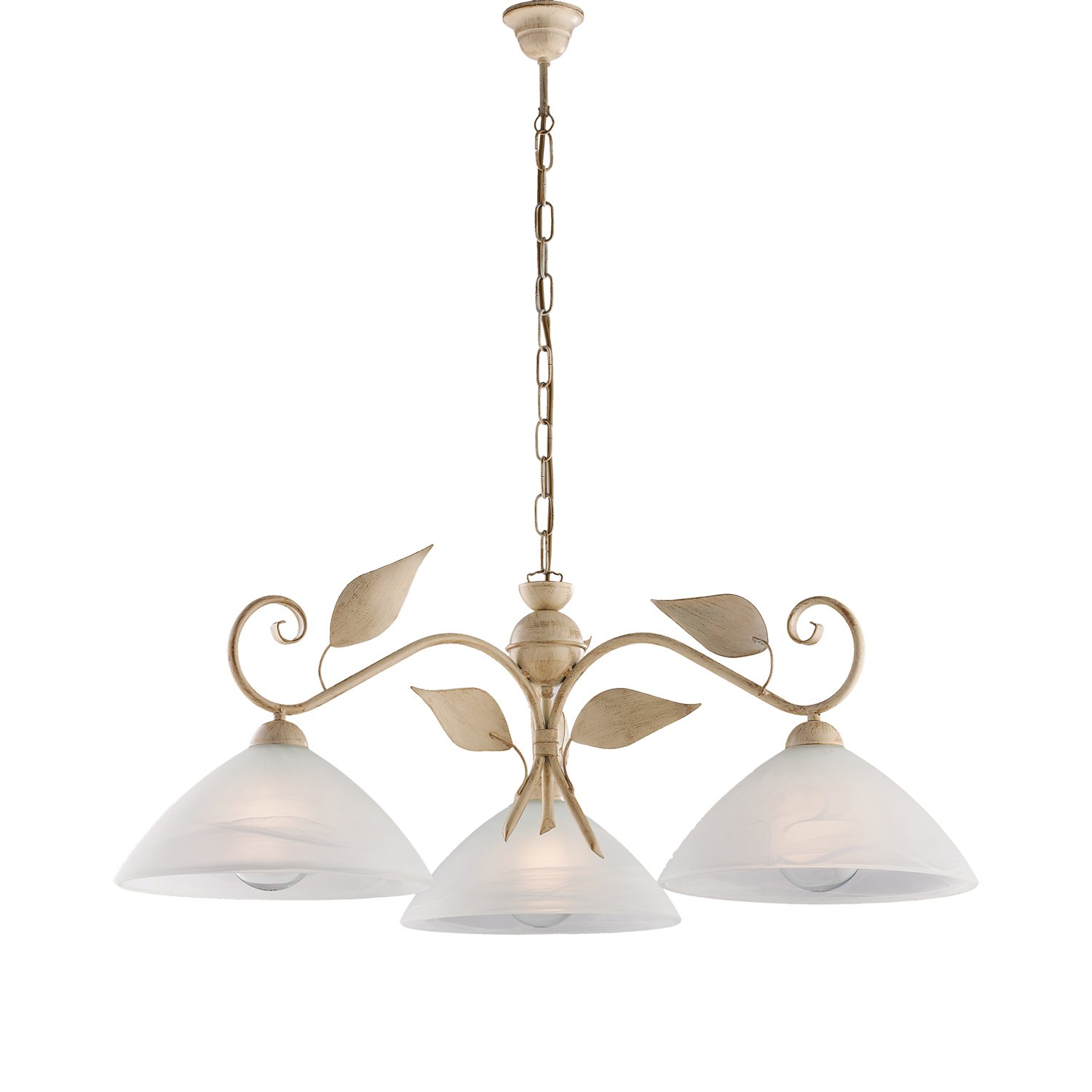 Lampadario 3 luci in ferro battuto forgiato a mano e laccato avorio con decorazione effetto antichizzato oro. . Corredato con ampi diffusori in vetro centrifugato alabastro bianco. E' possibile modificare l'altezza del lampadario grazie alla catena regolabile, rendendo questa sospensione adattabile a tutti gli spazi. Disponibile anche nella versione bianco e argento. I colori sono solitamente neutri e tenui e aiutano a creare un'atmosfera calma e rilassante. Le linee sono pulite e semplici, con curve eleganti e dettagli floreali: la combinazione di semplicità e raffinatezza.