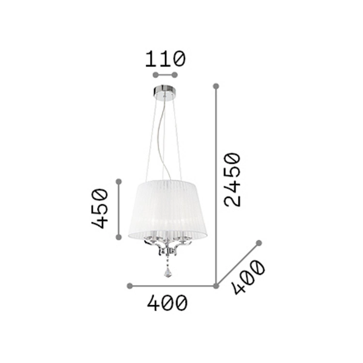 Sospensione diam.40 cm con 3 luci E14 max 40 W. Montatura in metallo cromato.. Corpo centrale, bobeches e pendagli in cristallo molato. Paralumi in organza. Copricatena in velluto.