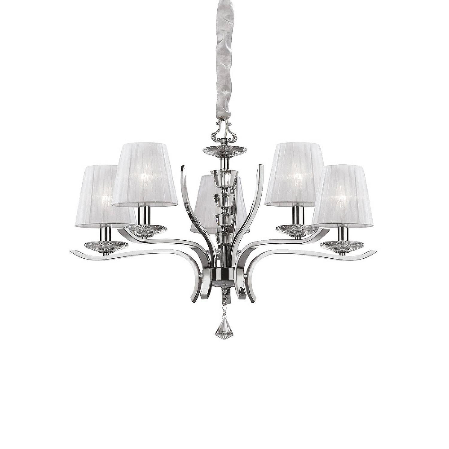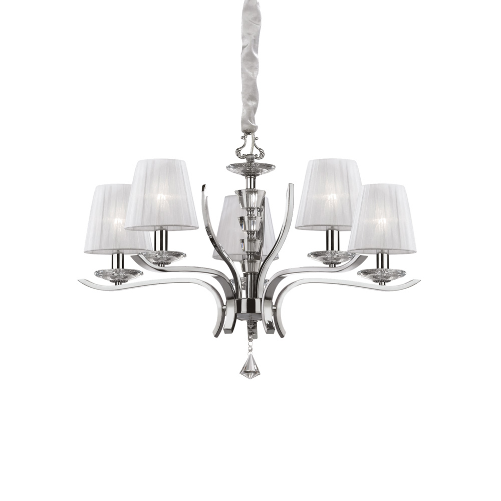 Collezione PEGASOCOMPLEMENTI D'ARREDO PER ILLUMINARE CON ELEGANZALampadario diam.72 cm con 5 luci E14 max 40 W. Montatura in metallo cromato. Corpo centrale, bobeche..