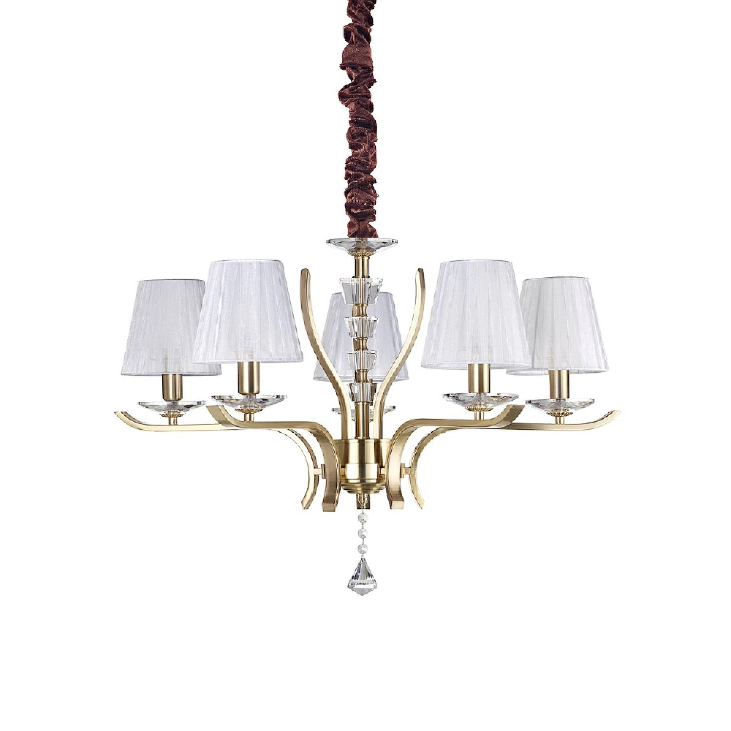 Lampadario diam.72 cm a 5 luci E14 max 40 W. Montatura in metallo ottone satinato. Corpo centrale, bobeches e pendagli in cristallo molato.. Paralumi in organza. Copricatena in velluto.
