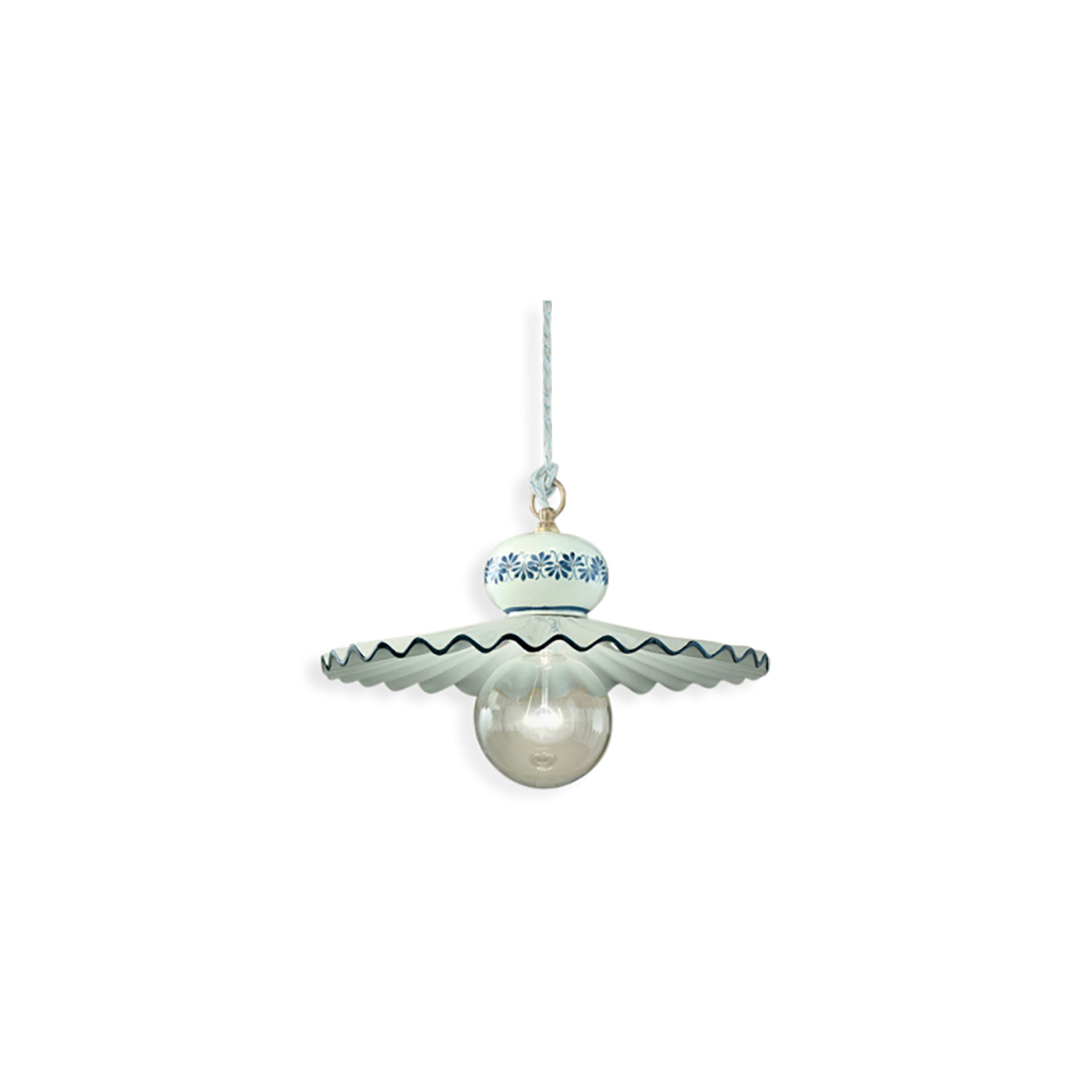 Collezione ROMALUCE CHE DANZA NELL'AMBIENTE CREANDO MAGIASospensione 1 Luce E27 diametro 23 cm in ceramica decoro Filo blu con montatura ottone satinato frutto di un..