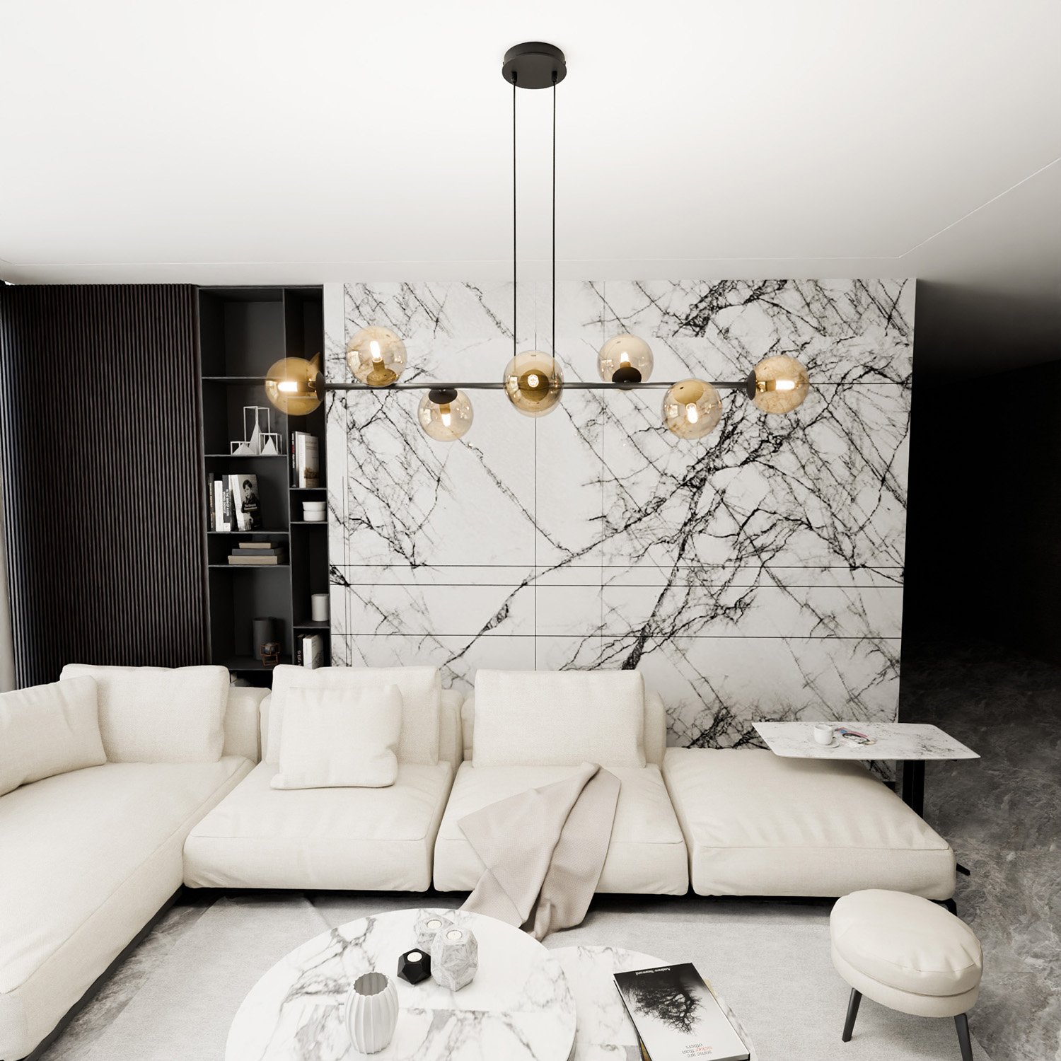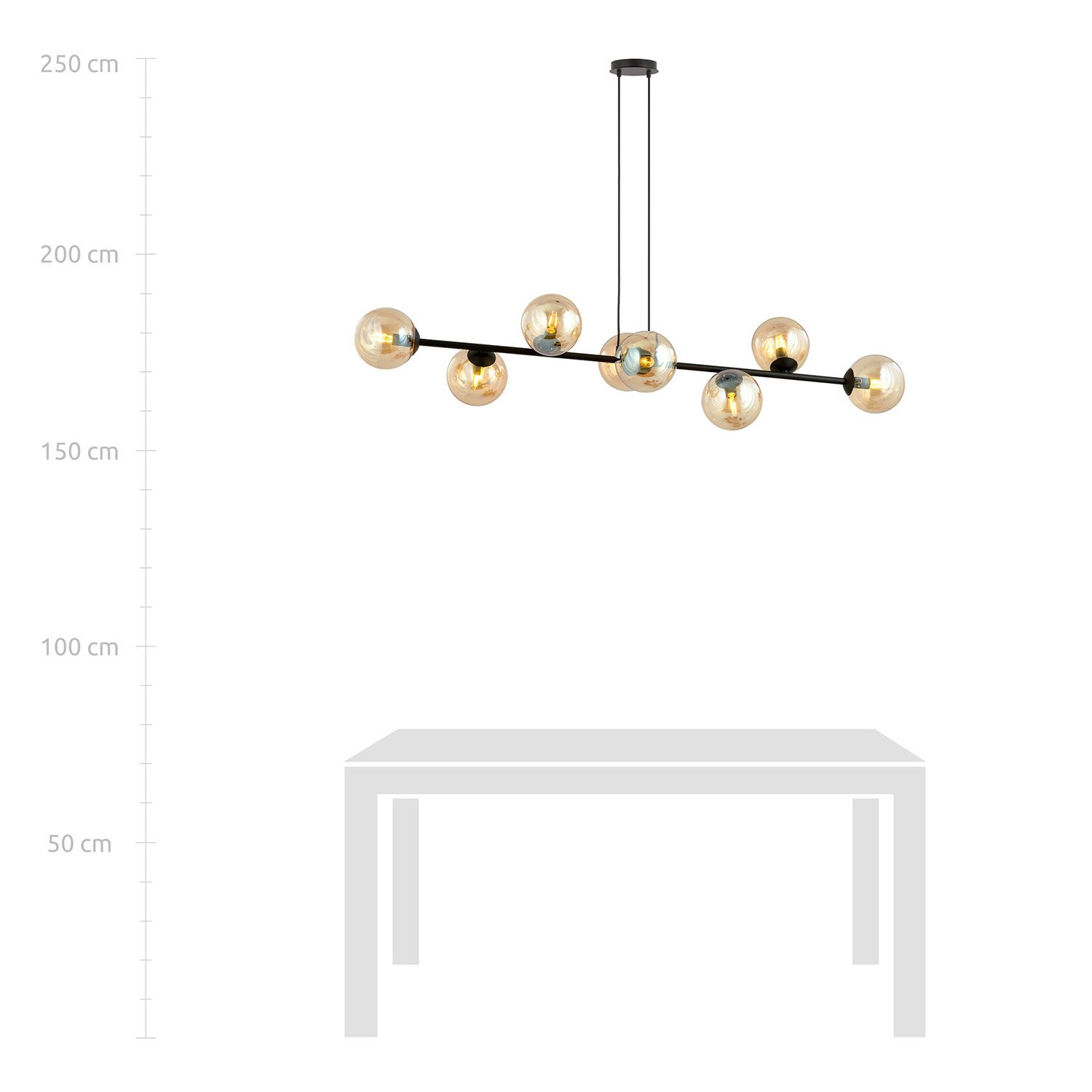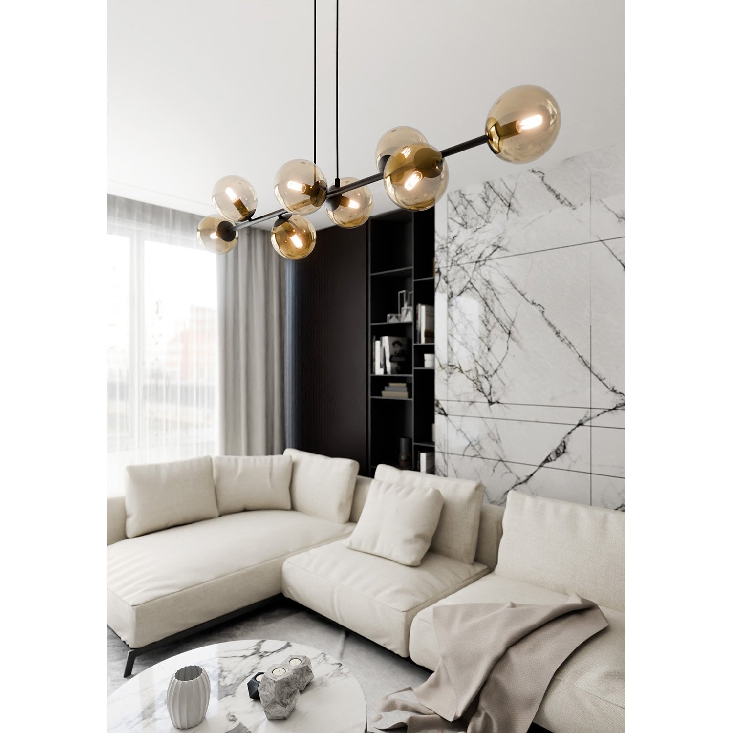 Lampaario 8 luci realizzato con base in metallo di colore nero e braccio sospeso con 8 paralumi sferici in vetro color ambra. Il suo stile minimalista si adatta alle ultime tendenze pur mantenendo un'eleganza senza tempo. I paralumi in vetro più trendy garantiscono un'eccellente illuminazione della stanza.