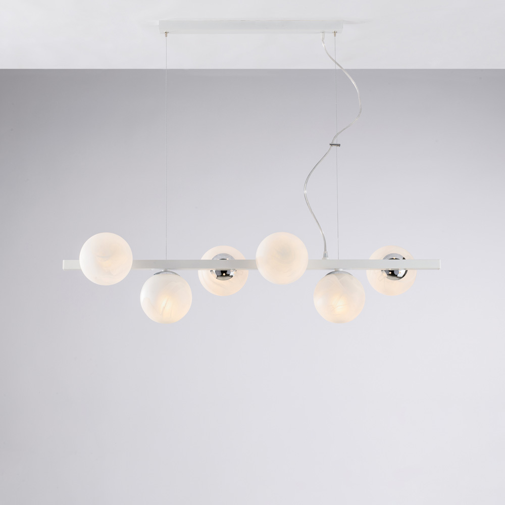 La sospensione è composta da una struttura in ferro laccato di colore bianco e cromo,con 6 sfere disposte in modo simmetrico attorno alla struttura principale.. La forma della sospensione è lineare e presenta un design moderno ed elegante, caratterizzato da linee pulite e curve morbide. Monta sulla struttura principale 6 diffusori in vetro soffiato bianco alabastro, per diffondere uniformemente la luce nell'ambiente circostante. La sospensione è progettata per essere installata al soffitto, utilizzando un sistema di fissaggio regolabile che consente di regolare l'altezza della sospensione in base alle esigenze dell'ambiente. Grazie al suo design contemporaneo e alla sua funzionalità, la sospensione può essere utilizzata per illuminare e decorare diverse aree della casa o dell'ufficio, come il soggiorno, la sala da pranzo o lo studio. Tutti i nostri articoli sono prodotti esclusivamente in Italia e rispettano rigorosamente le normative CE. Prodotti realizzati per la maggior parte dei casi senza l'ausilio delle macchine salvo qualche eccezione in cui, le stesse, sono utilizzate in modo marginale. Le piccole imperfezioni e le variazioni nelle misure sono, quindi, non da attribuirsi ad un difetto di fabbricazione quanto alla particolarità ed alla composizione stessa del prodotto interamente confezionato a mano. Essendo prodotti realizzati artigianalmente, su richiesta è possibile effettuare piccole modifiche o personalizzazioni al prodotto.