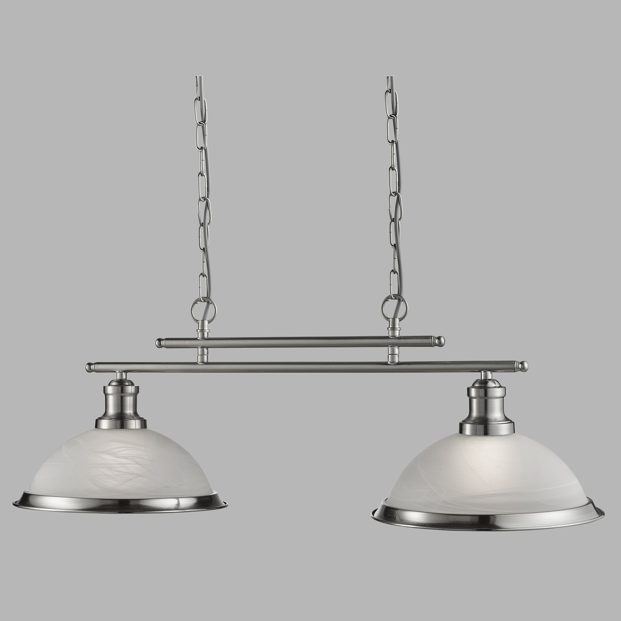 Questa lampada a sospensione da soffitto Bistro in argento satinato a 2 luci con paralumi in vetro acido ha un aspetto semplicistico. Aggiungerà un tocco retrò a qualsiasi sala da pranzo o cucina. Ricorda lo stile dei classici diner e bistrot, è composto da due classici paralumi art déco posizionati lungo un'elegante barra con finitura argento satinato, con vetro acido per fornire effetti di luce puliti. Questa barra luminosa da soffitto dona uno stile distintivo ed elegante a qualsiasi ambiente e la catena può essere regolata per diverse altezze del soffitto.