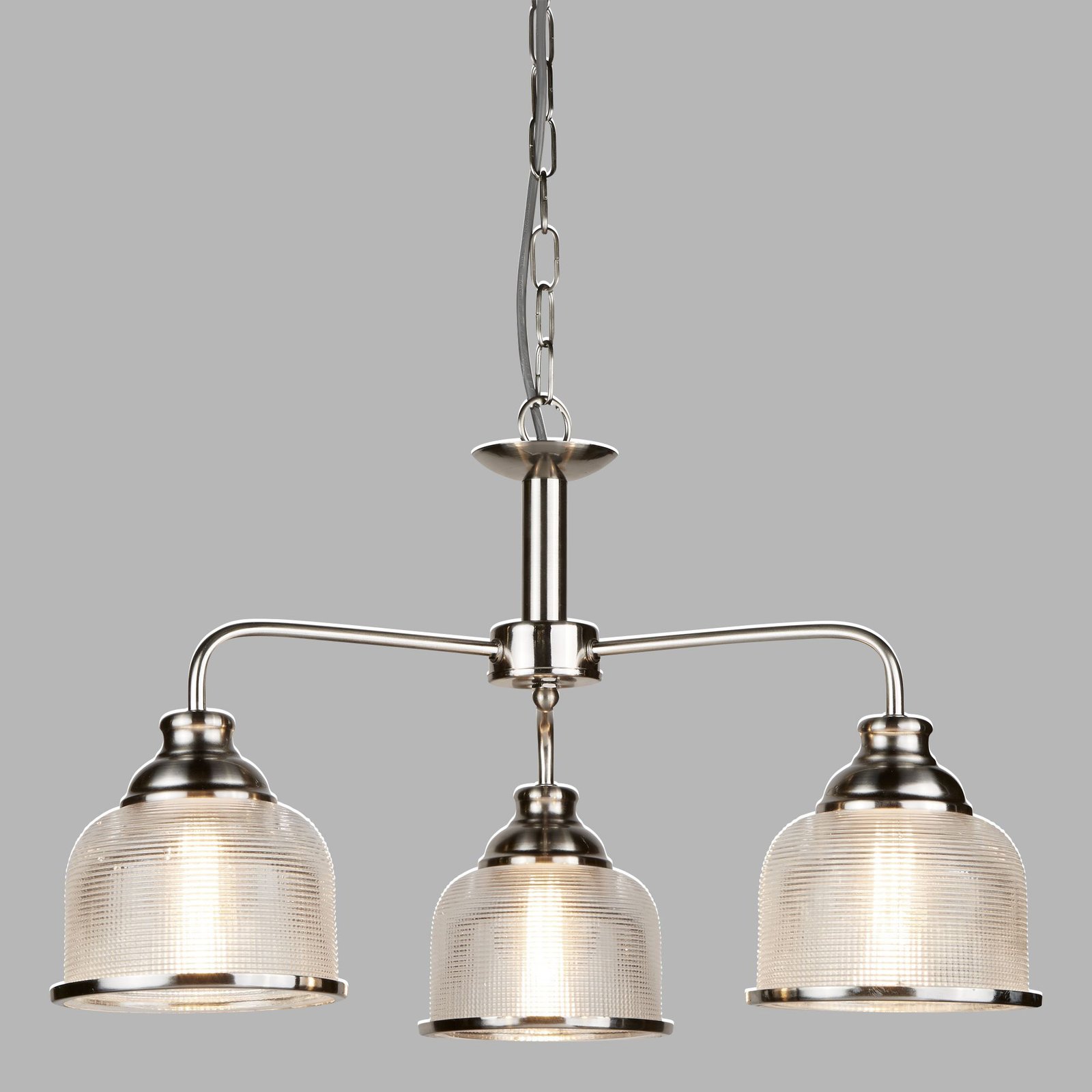 Realizzata in acciaio dolce e vetro, la bellissima sospensione a 3 luci Bistro II ha un aspetto fantastico se posizionata in una cucina o in una sala da pranzo. L'oggetto ha un aspetto classico con un mix di vetro in stile olofano e metallo argentato satinato. La sensazione strutturata del vetro in stile olofano funge da diffusore per le luci, creando una sospensione semplice ma elegante. Regolabile in altezza tramite la sospensione a catena, questa sospensione a 3 luci può essere adattata a diverse altezze del soffitto.