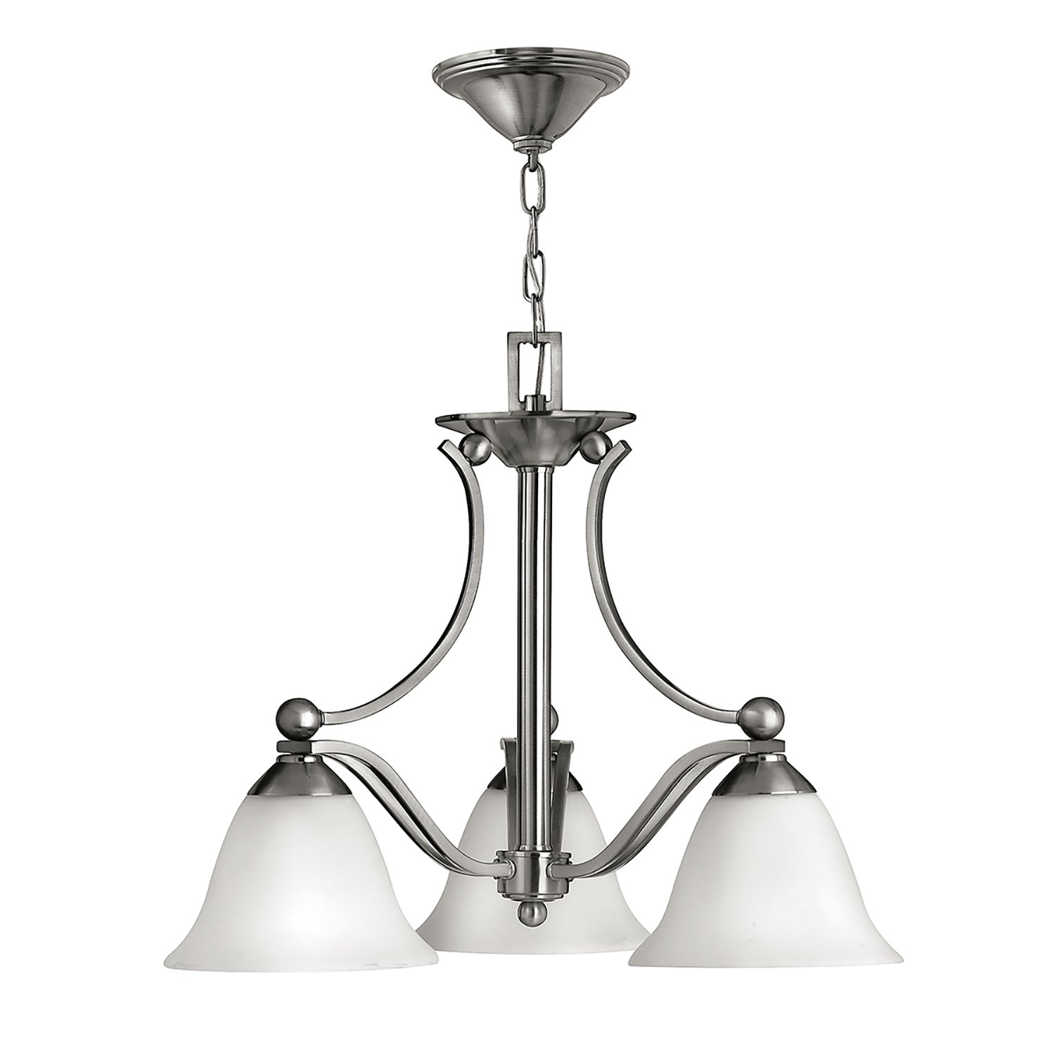 Lampadario a 3 luci. Le linee aggraziate dei doppi bracci di Bolla creano una morbida eleganza, mentre le sfere appollaiate sulle estremità aggiungono uno stile innovativo. Le forti proporzioni dei bracci in finitura nichel spazzolato contrastano con il sottile vetro a campana, combinando dettagli tradizionali e moderni.