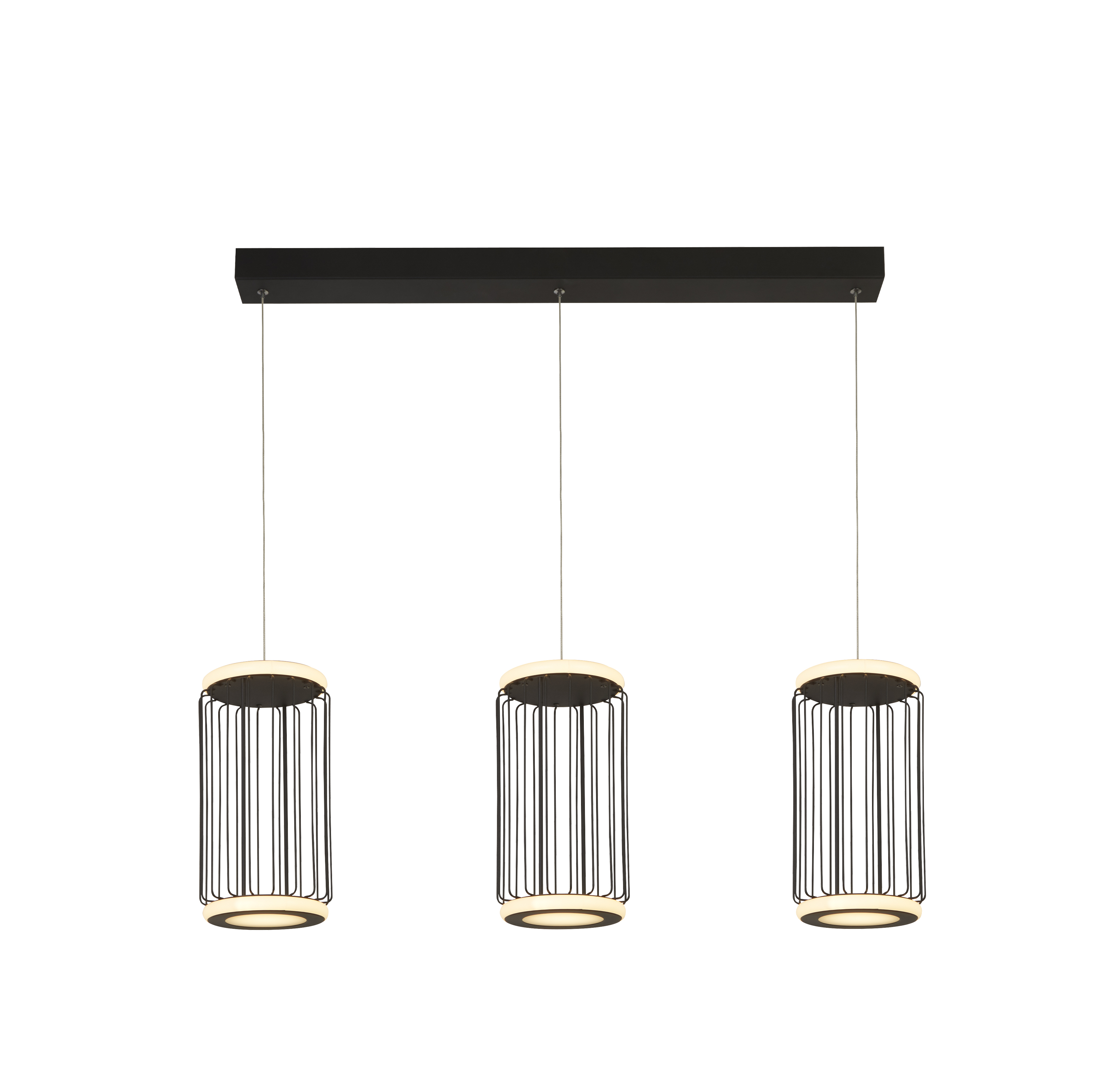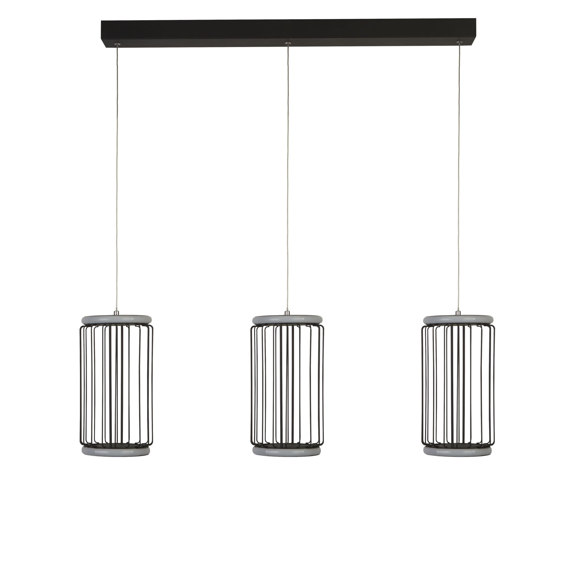 Collezione CircoloELEGANZA CILINDRICALa lampada a sospensione Circolo Cage Bar da 3 luci, realizzata con una combinazione di metallo nero e silicone bianco. Presenta..