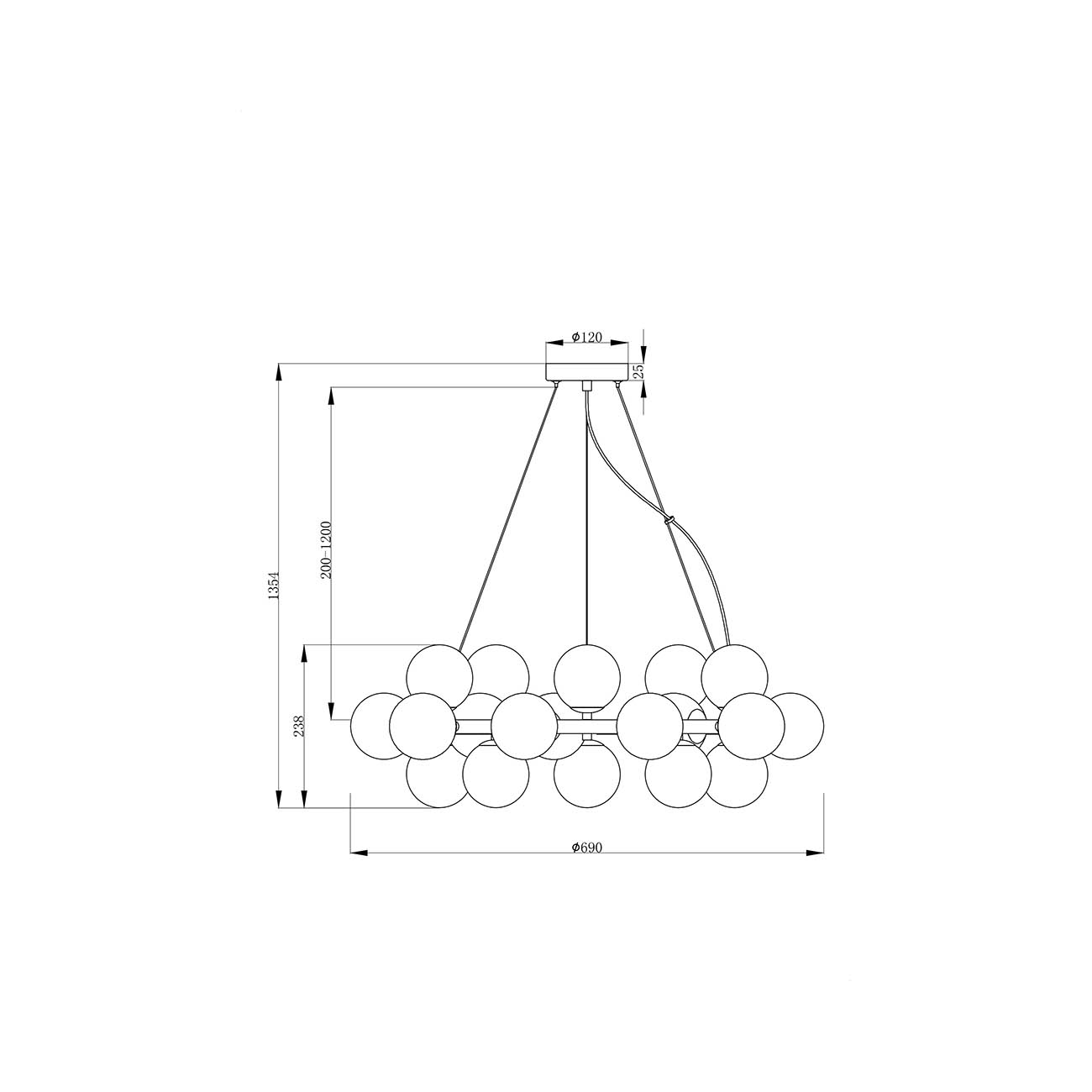 Lampadario contemporaneo Dallas con struttura in metallo oro e 25 luci, dotato di diffusori in vetro soffiato bianco opaco.. Il design ispirato alla struttura molecolare conferisce a questo lampadario un aspetto moderno ed elegante. La lunghezza dei cavi delle lampade a sospensione è regolabile, permettendo di personalizzare l'altezza del lampadario in base alle proprie esigenze. La sorgente luminosa utilizzata è una lampadina con attacco G9, che assicura un'illuminazione uniforme e diffusa. Questo lampadario è perfetto per illuminare grei ambienti, come soggiorni, sale conferenze e uffici.