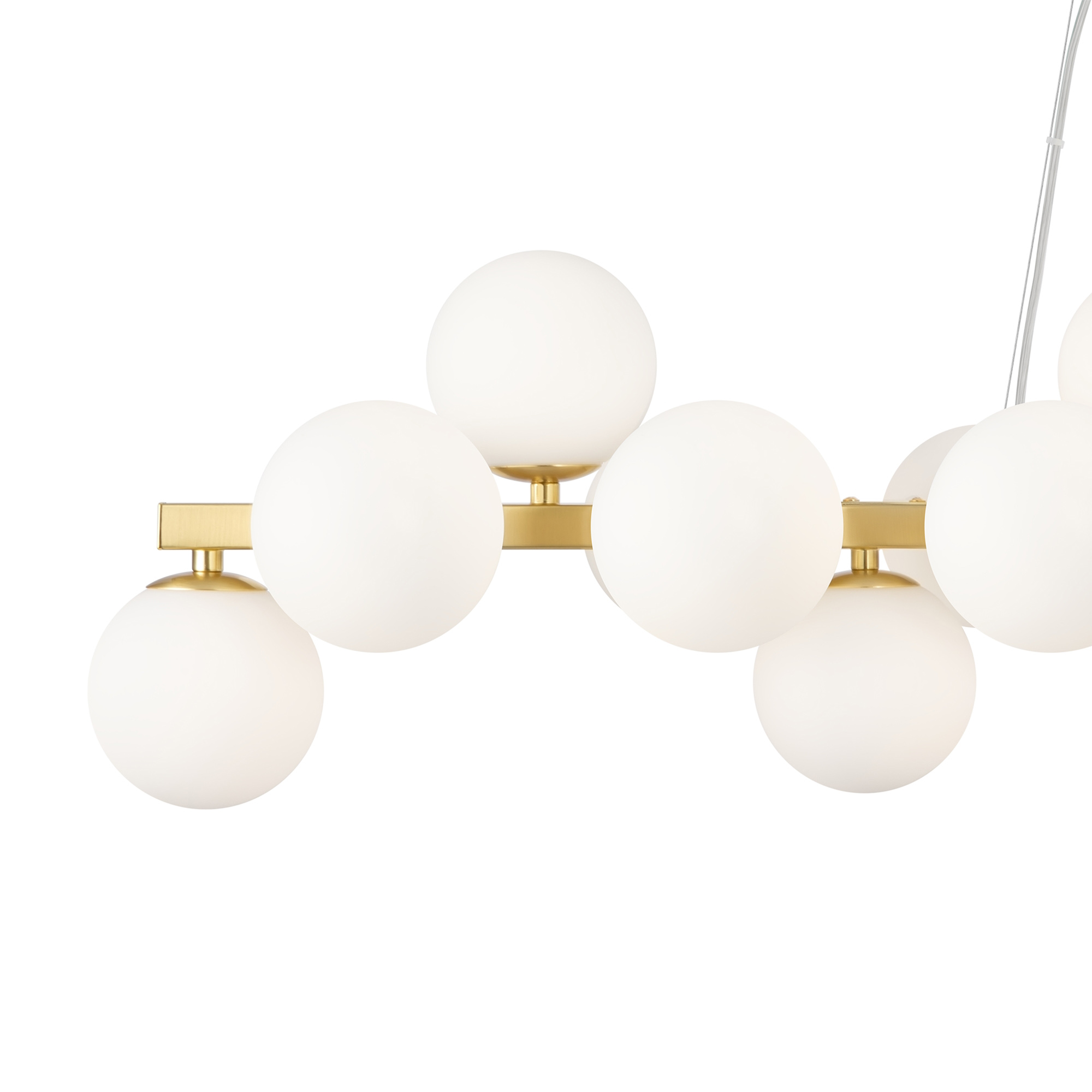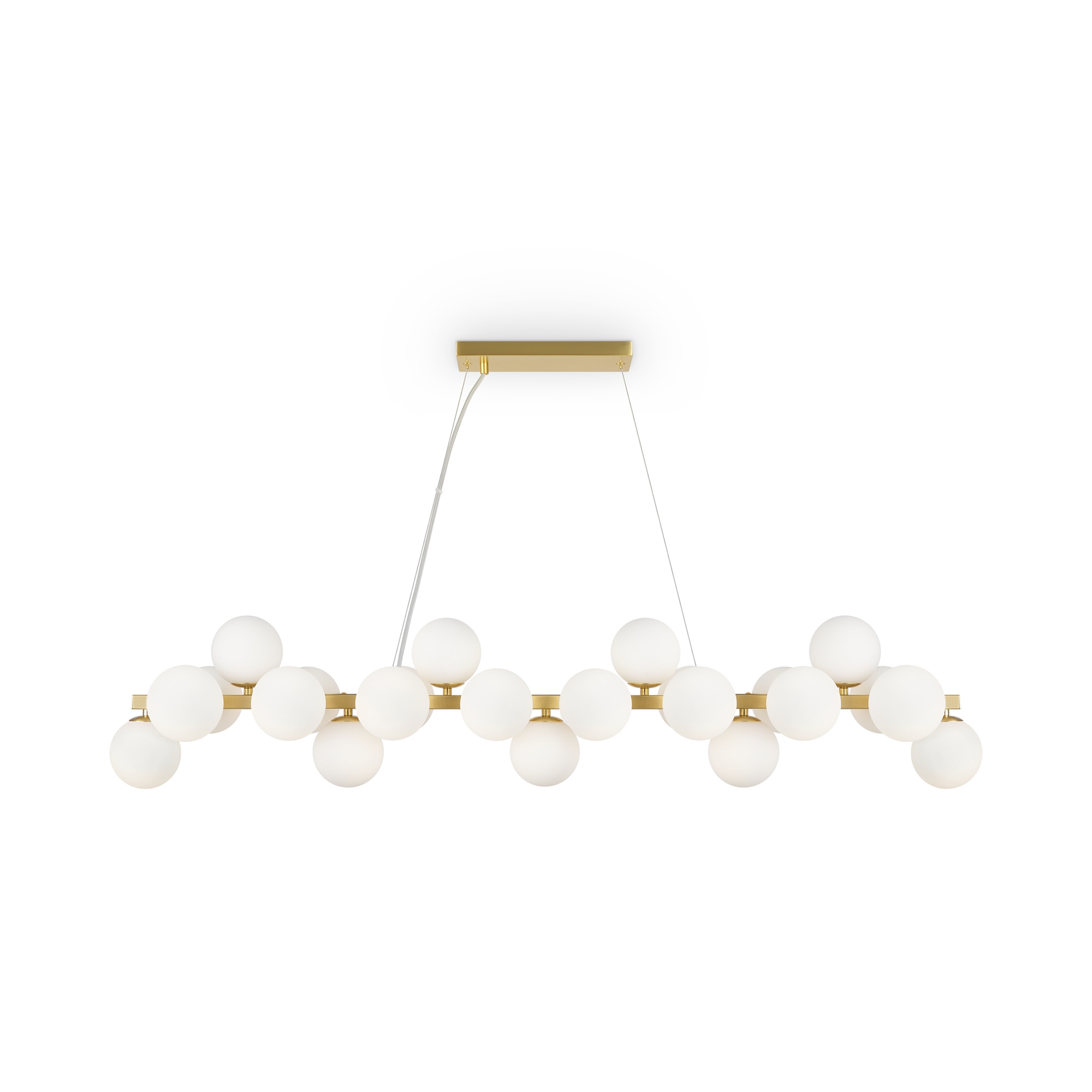 Lampadario contemporaneo Dallas con struttura in metallo oro e bianco e 25 luci, dotato di diffusori in vetro soffiato.. Il design ispirato alla struttura molecolare conferisce a questo lampadario un aspetto moderno ed elegante. La lunghezza dei cavi delle lampade a sospensione è regolabile, permettendo di personalizzare l'altezza del lampadario in base alle proprie esigenze. La sorgente luminosa utilizzata è una lampadina con attacco G9, che assicura un'illuminazione uniforme e diffusa. Questo lampadario è perfetto per illuminare grei ambienti, come soggiorni, sale conferenze e uffici.