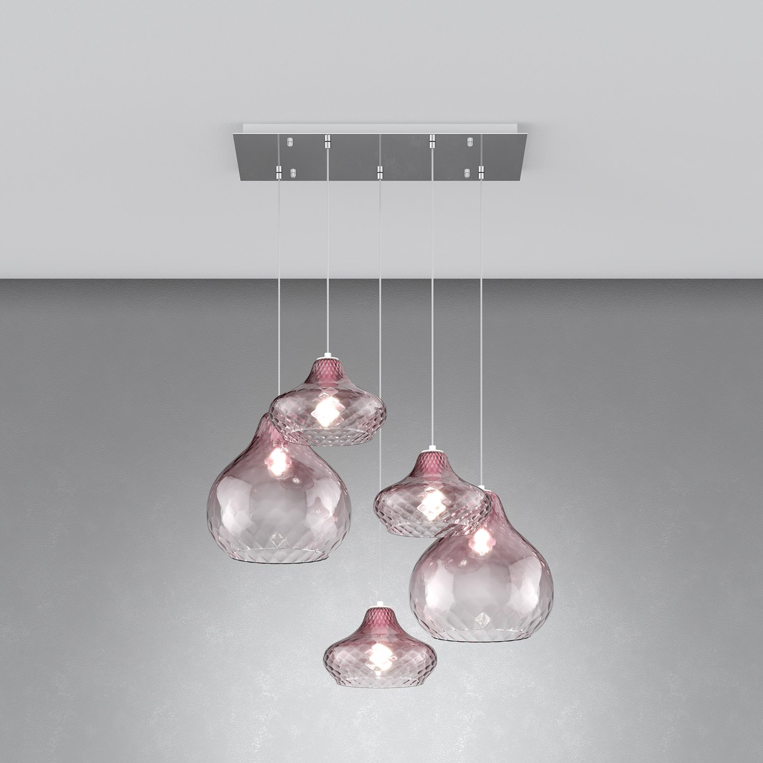 Collezione di lampade a sospensione composte da uno o più elementi in vetro soffiato regolabili in altezza. Gli elementi in vetro, disponibili in due dimensioni, sono caratterizzati da una lavorazione a rombi presente all'interno del vetro che ne arricchisce e valorizza il design. La serie viene completata da due modelli di lampade da parete, una da plafone e da una lampada da appoggio. Le finiture dei vetri sono ambra, rubino e zaffiro. Le strutture dei rosoni sono disponibili nelle finiture cromo, bianco e ottone satinato, mentre le finiture del portalampada sono unicamente di colore bianco.