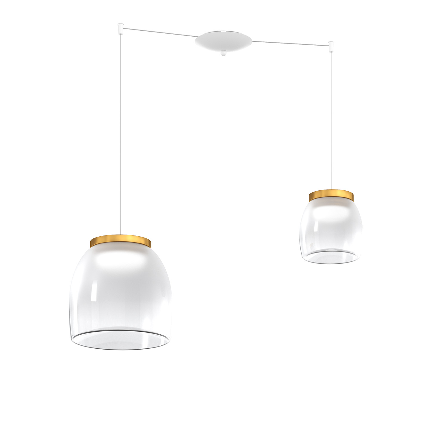 Collezione di lampade a sospensione composta da uno o più diffusori in vetro pirex soffiato regolabili in altezza. Con una forma elegante e preziosa, il vetro trasparente con decorazione satinata e sfumata ben si adatta a tutti gli ambienti. I rosoni a soffitto sono di colore bianco, mentre il decoro dove è fissato il vetro è disponibile a scelta nelle finiture bianco e oro opaco. Le sorgenti luminose a led integrato sono dimmerabili con regolatore Triac (non incluso) e studiate per valorizzare il vetro e diffondere ottimamente la luce. La serie viene completata da una lampada da parete, due lampade da plafone e due lampade da appoggio.